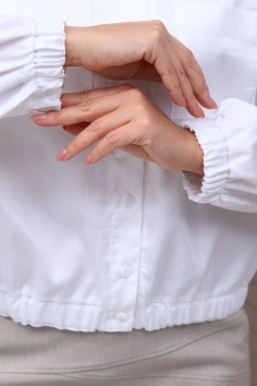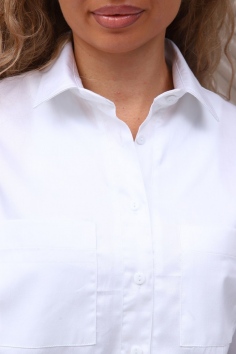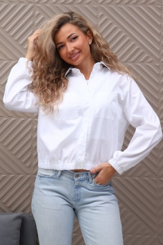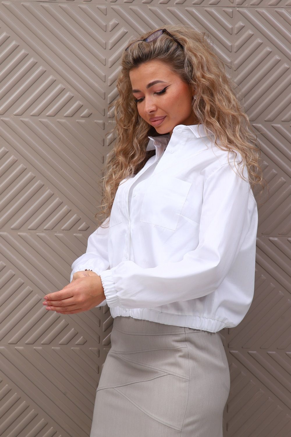 Рубашка женская в спортивном стиле (силуэт - 'бомбер'), из премиального сатина (100% хлопок). Новый трендовый силуэт выделяют её среди других белых рубашек. Низ изделия и манжеты на резинке. Резинка по низу рубашки создаёт силуэт, посадка по фигуре задумана без натяжения резинки. Манжеты на рукавах не тугие, тоже свободная посадка. Планка на пуговицах. Данная рубашка - универсальный выбор и для делового стиля (отлично сочетается с классическими юбками и брюками), и для повседневной одежды (сочетается с джинсами, спортивными штанами).