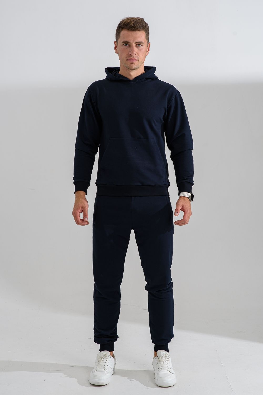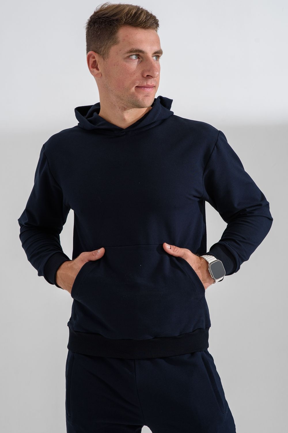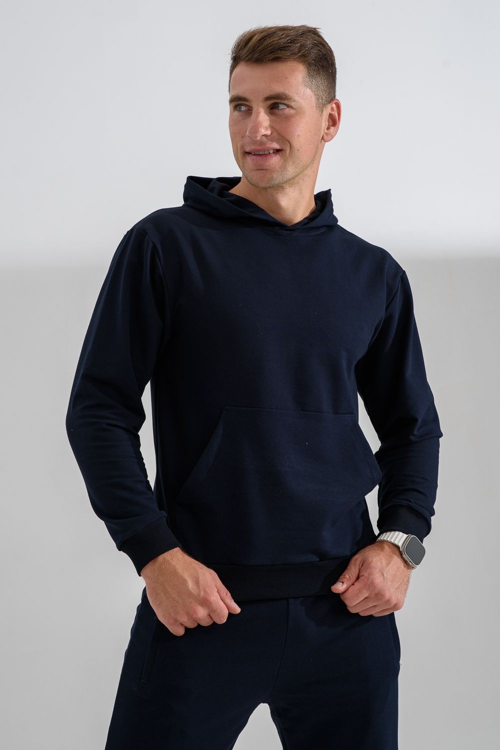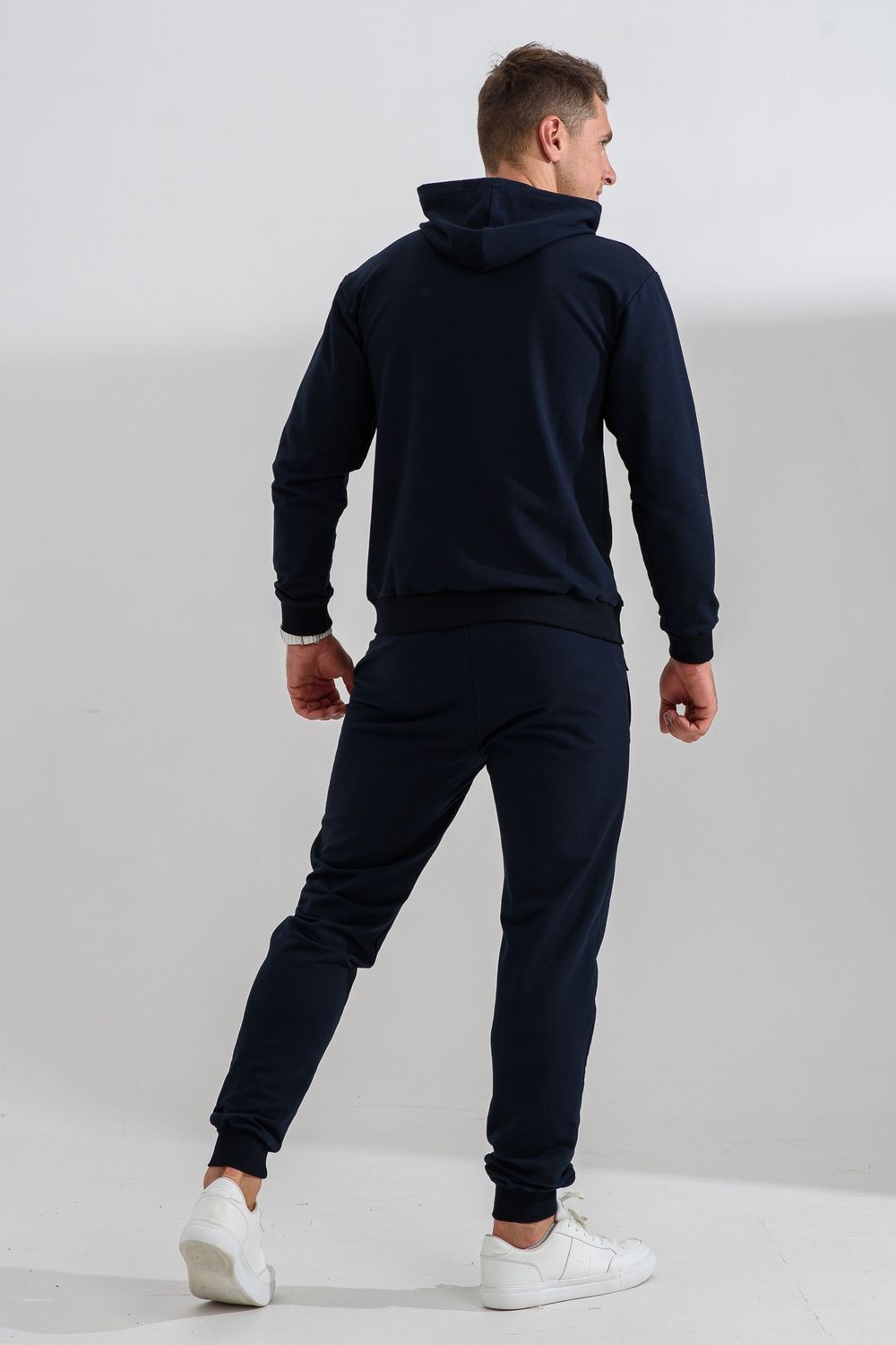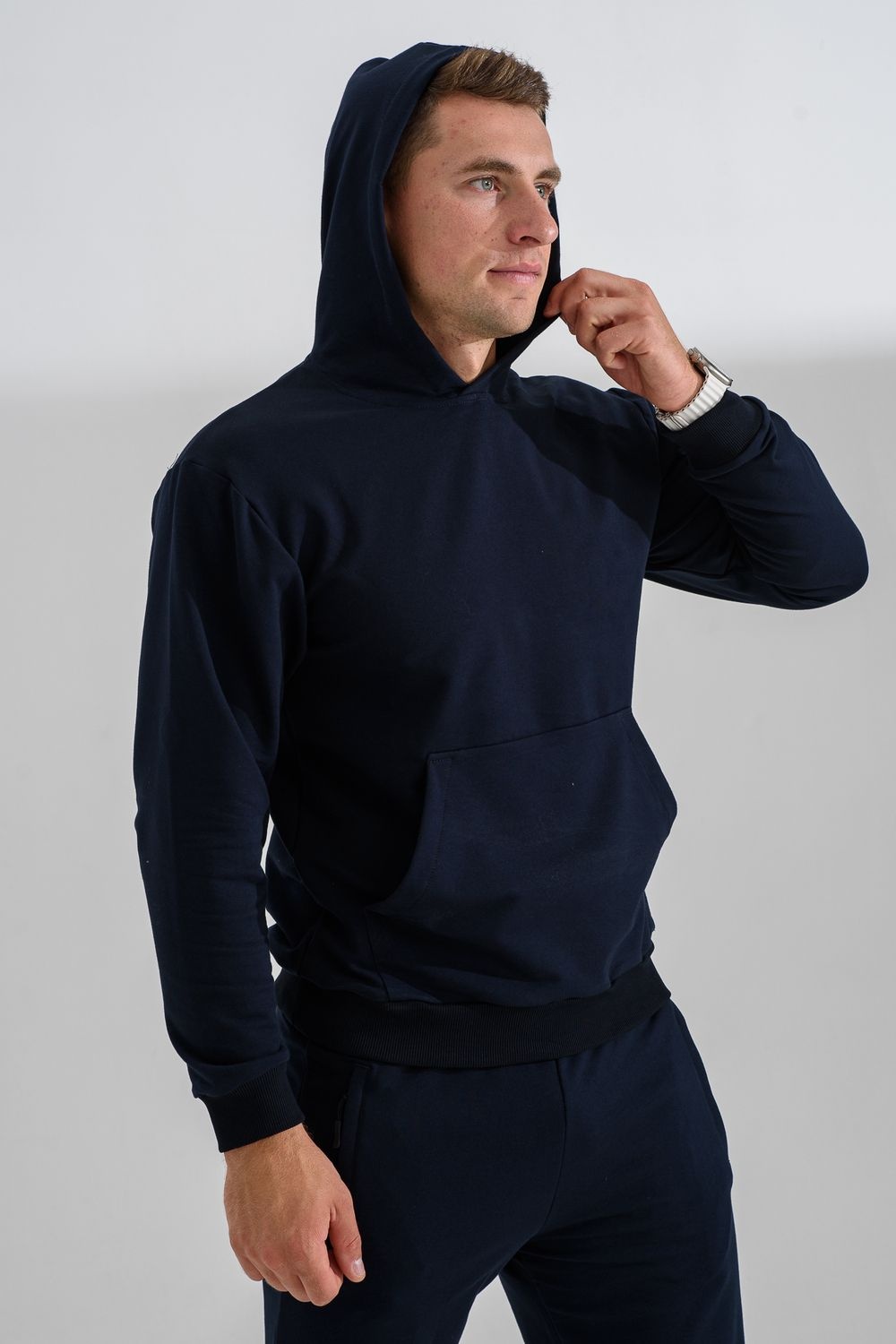 Костюм спортивный мужской с худи и джоггерами. Костюм свободного кроя состоит из толстовки с капюшоном и карманом кенгуру и брюк джоггеров на манжете с карманами в боковых швах. Костюм однотонный сшит из качественного хлопкового трикотажного материала - футера 2-х нитки. Обладает отличной эластичностью, не сковывает движений. Идеален для занятий спортом. Зимой костюм возможно носить в тренажерный зал или использовать как домашнюю одежду.