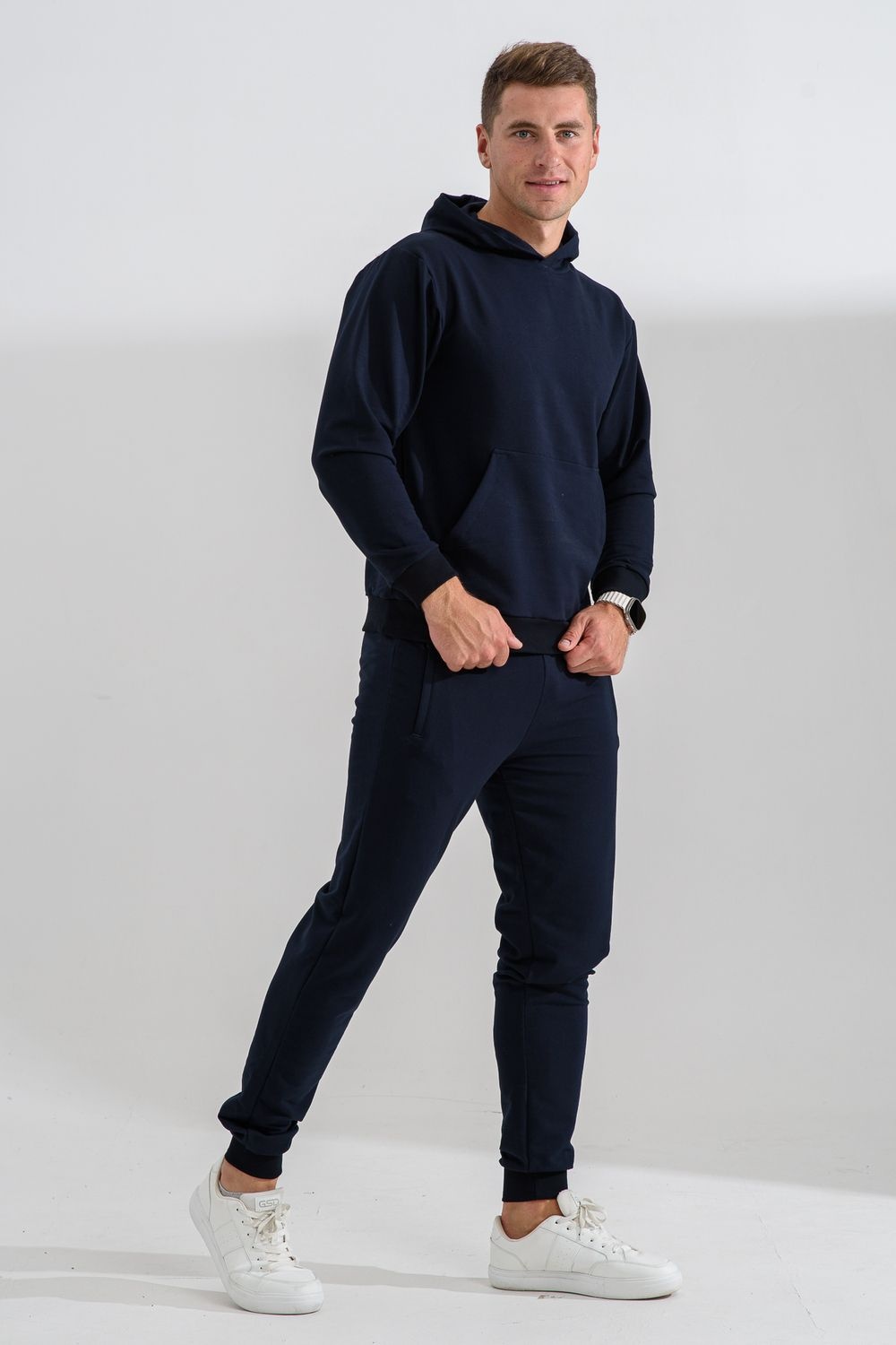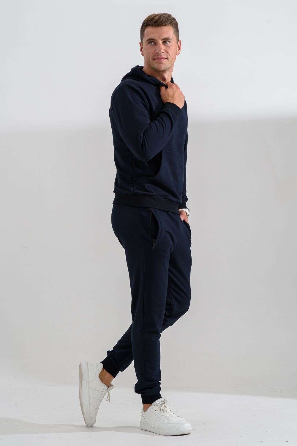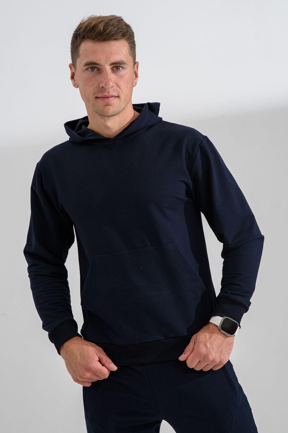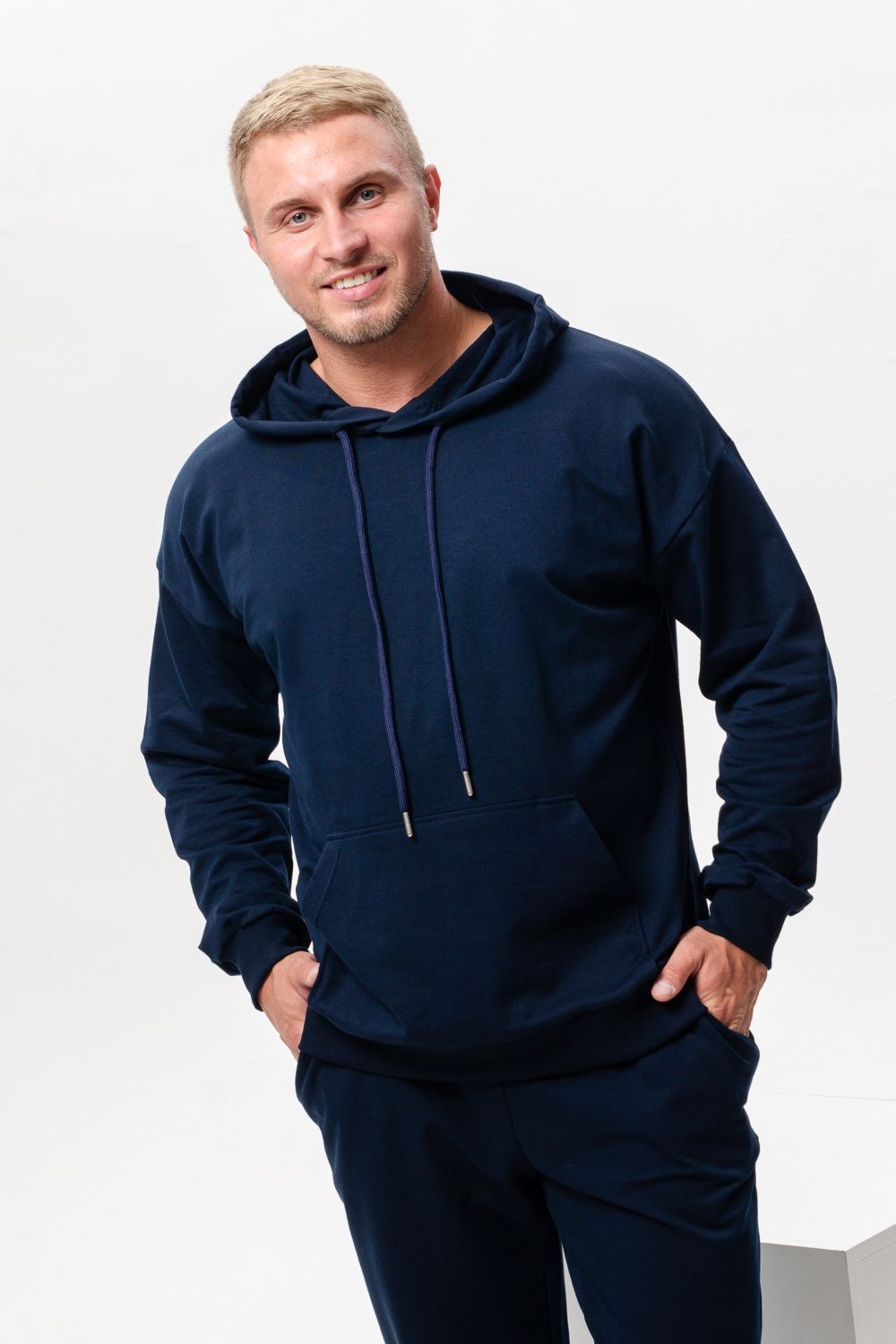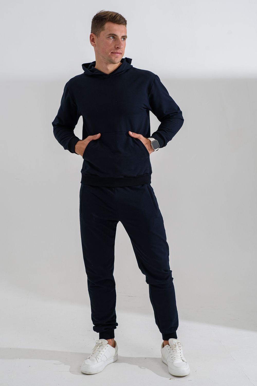 Костюм спортивный мужской с худи и джоггерами. Костюм свободного кроя состоит из толстовки с капюшоном и карманом кенгуру и брюк джоггеров на манжете с карманами в боковых швах. Костюм однотонный сшит из качественного хлопкового трикотажного материала - футера 2-х нитки. Обладает отличной эластичностью, не сковывает движений. Идеален для занятий спортом. Зимой костюм возможно носить в тренажерный зал или использовать как домашнюю одежду.