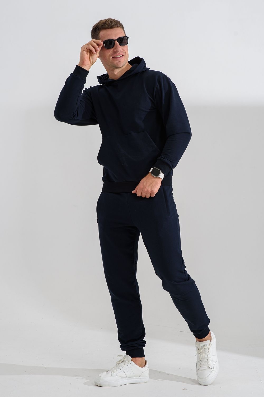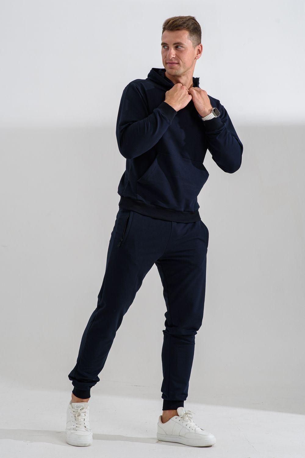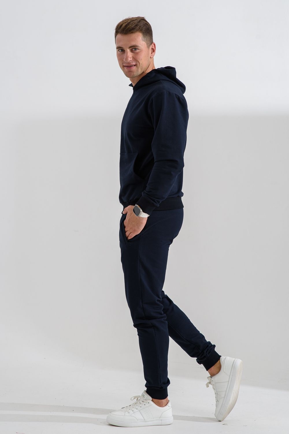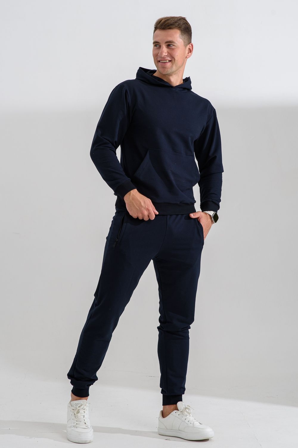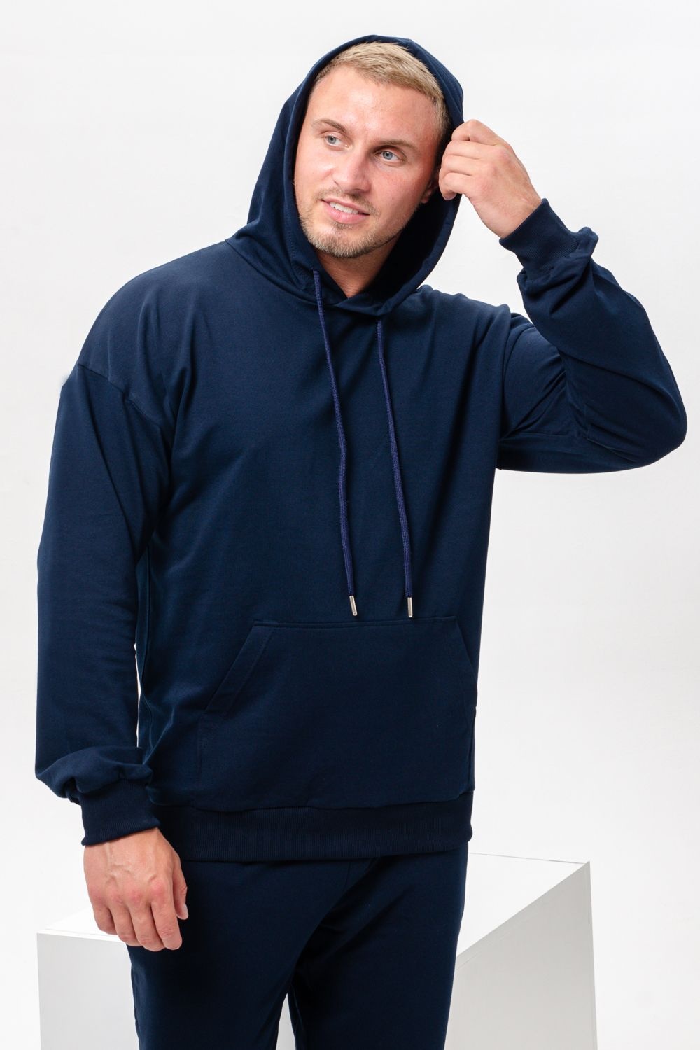 Костюм спортивный мужской с худи и джоггерами. Костюм свободного кроя состоит из толстовки с капюшоном и карманом кенгуру и брюк джоггеров на манжете с карманами в боковых швах. Костюм однотонный сшит из качественного хлопкового трикотажного материала - футера 2-х нитки. Обладает отличной эластичностью, не сковывает движений. Идеален для занятий спортом. Зимой костюм возможно носить в тренажерный зал или использовать как домашнюю одежду.