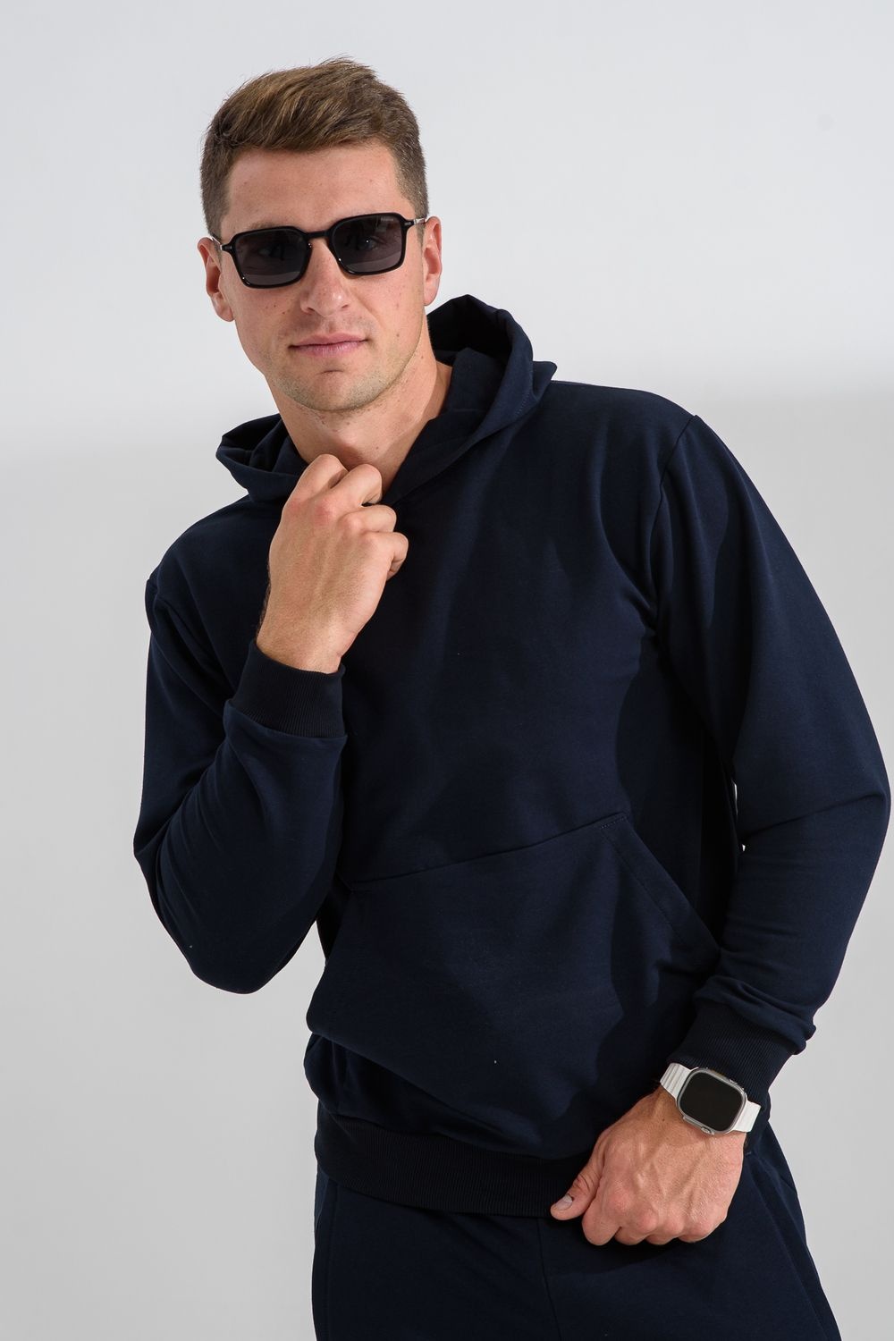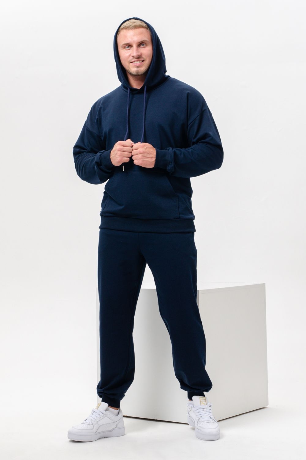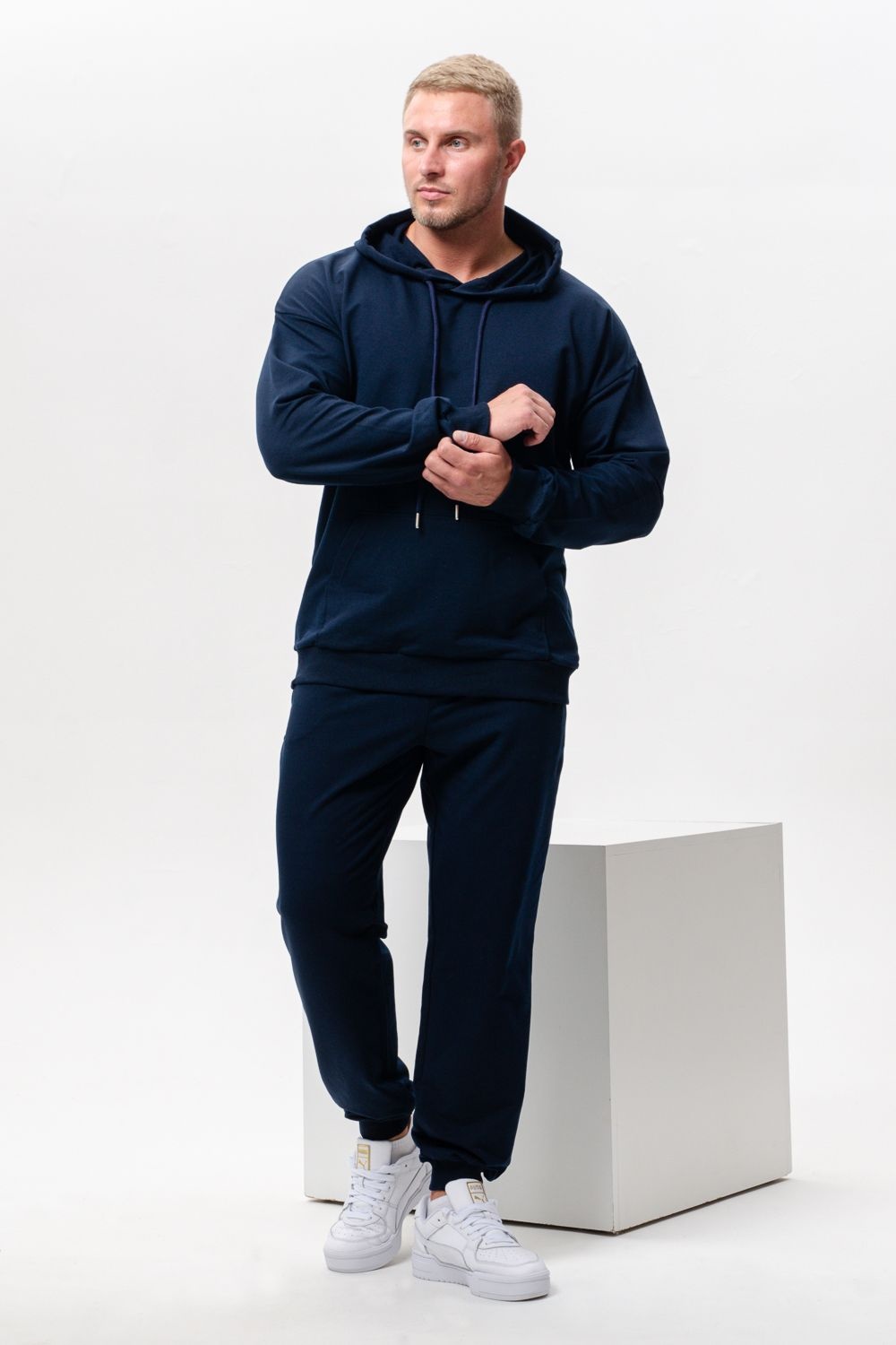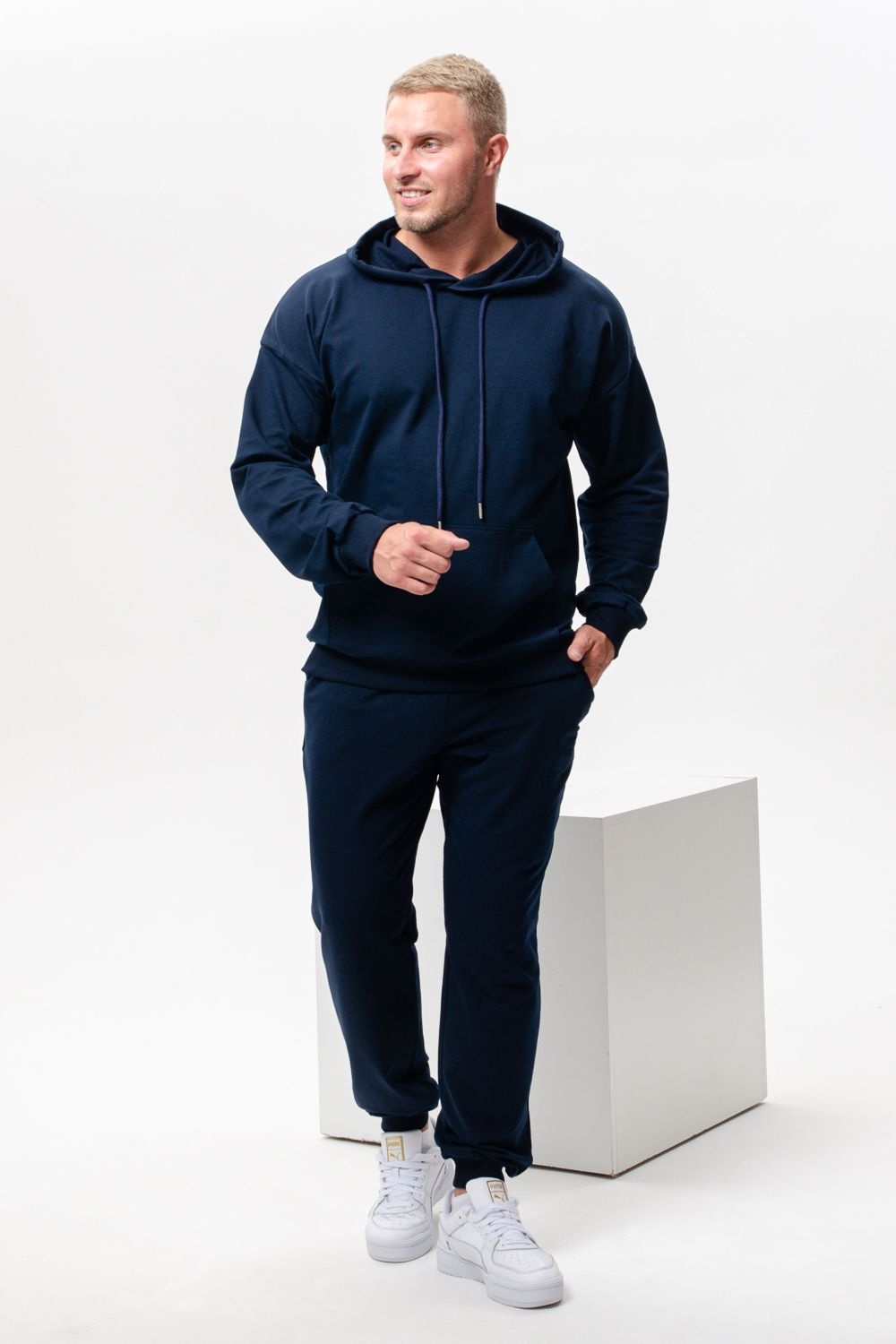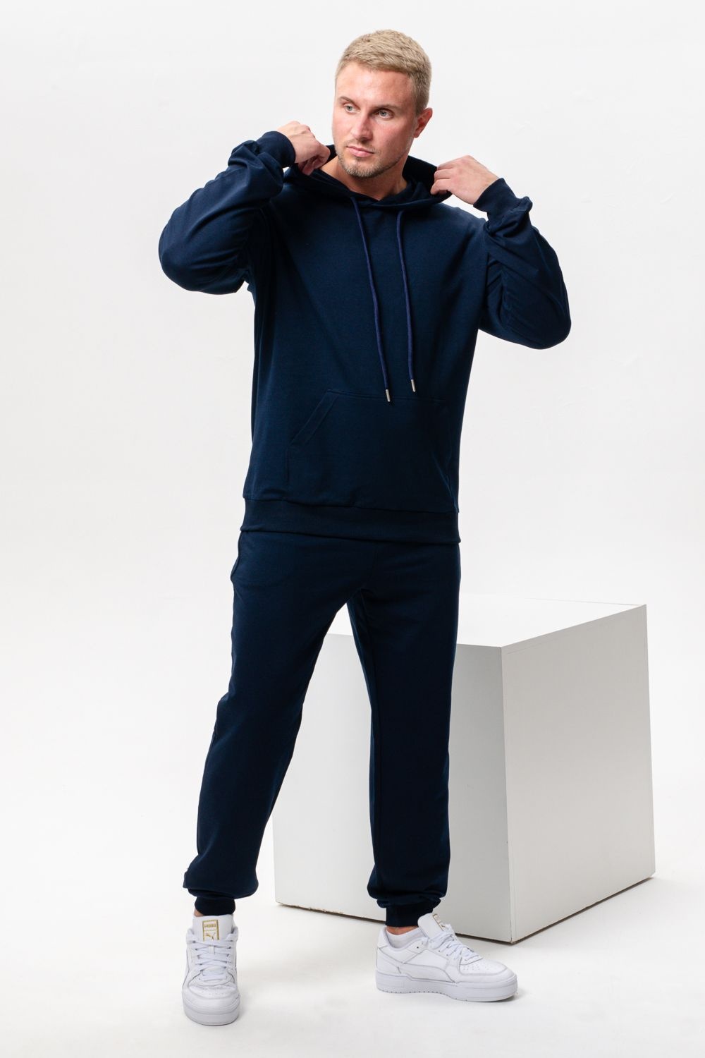 Костюм спортивный мужской с худи и джоггерами. Костюм свободного кроя состоит из толстовки с капюшоном и карманом кенгуру и брюк джоггеров на манжете с карманами в боковых швах. Костюм однотонный сшит из качественного хлопкового трикотажного материала - футера 2-х нитки. Обладает отличной эластичностью, не сковывает движений. Идеален для занятий спортом. Зимой костюм возможно носить в тренажерный зал или использовать как домашнюю одежду.