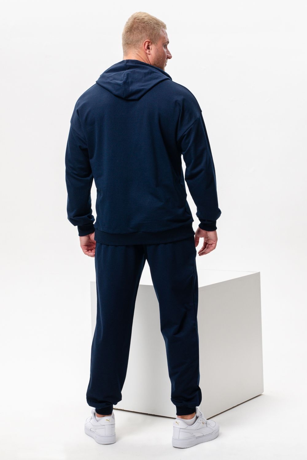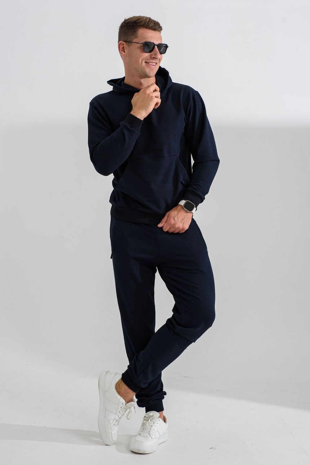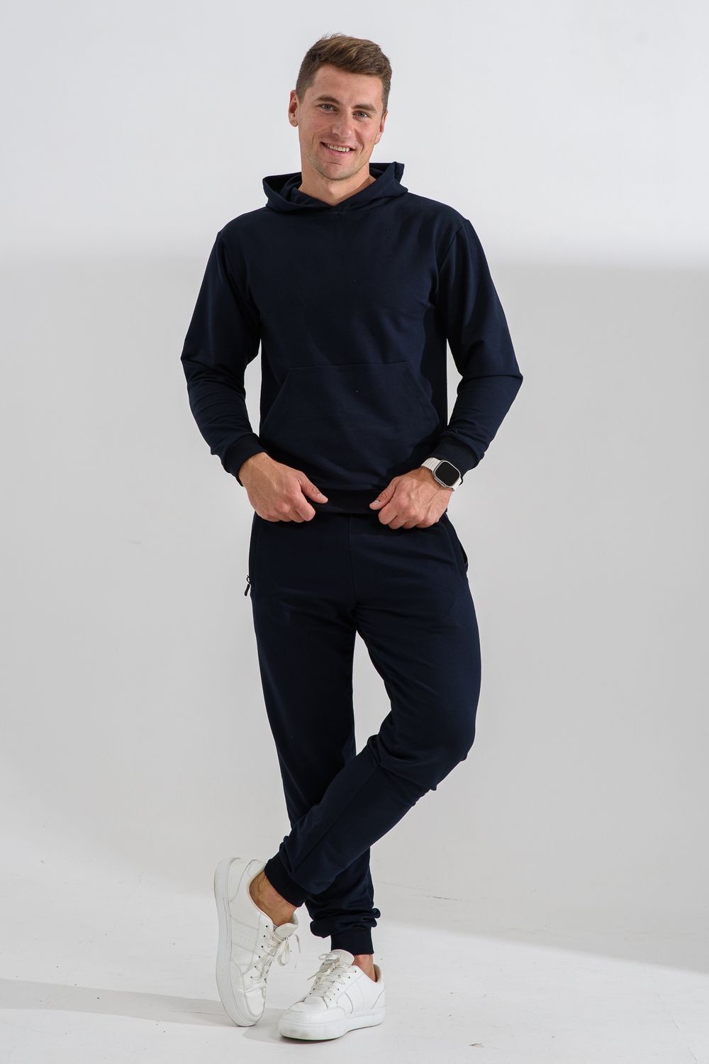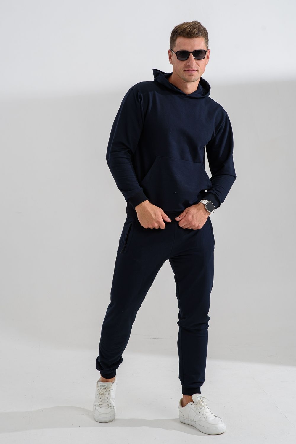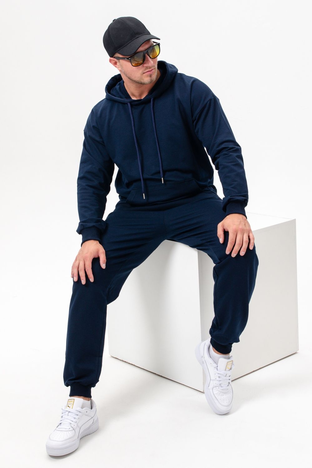 Костюм спортивный мужской с худи и джоггерами. Костюм свободного кроя состоит из толстовки с капюшоном и карманом кенгуру и брюк джоггеров на манжете с карманами в боковых швах. Костюм однотонный сшит из качественного хлопкового трикотажного материала - футера 2-х нитки. Обладает отличной эластичностью, не сковывает движений. Идеален для занятий спортом. Зимой костюм возможно носить в тренажерный зал или использовать как домашнюю одежду.