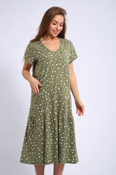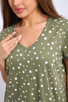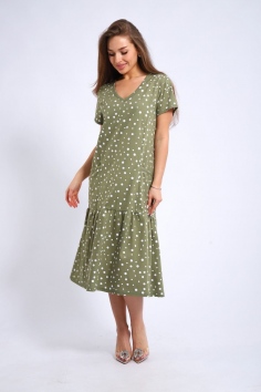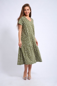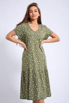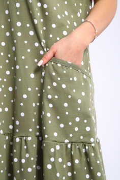 Платье женское выполнено из набивного трикотажного полотна кулирка. Платье свободного силуэта, с коротким рукавом. Вырез горловины 'намыс', накладные карманы. По низу оборка.