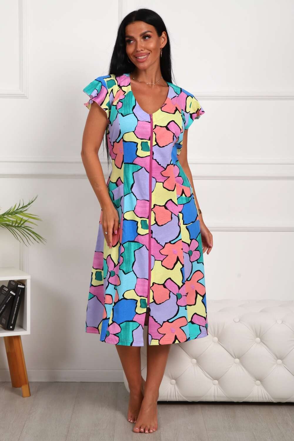 Легкий женский халатик из натурального трикотажа. Приталенный с поясом в боковых швах. Удобные накладные карманы. Расклешённый к низу. Длина миди. Игривый рукав крылышко. Горловина V-образной формы. Для более комфортной посадки на фигуре, на полочках и спинке рельефные швы. Застежка на тесьму молнию.