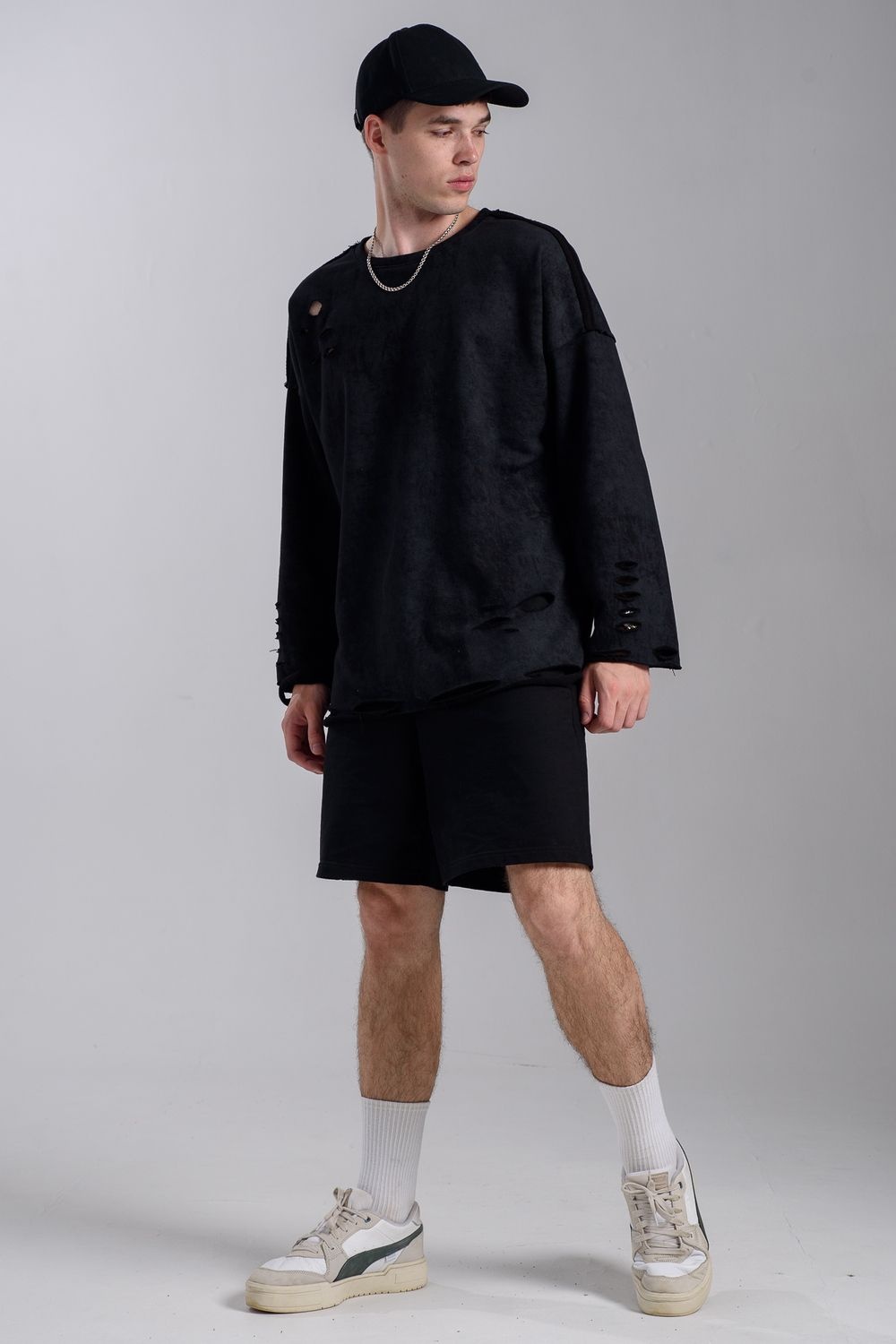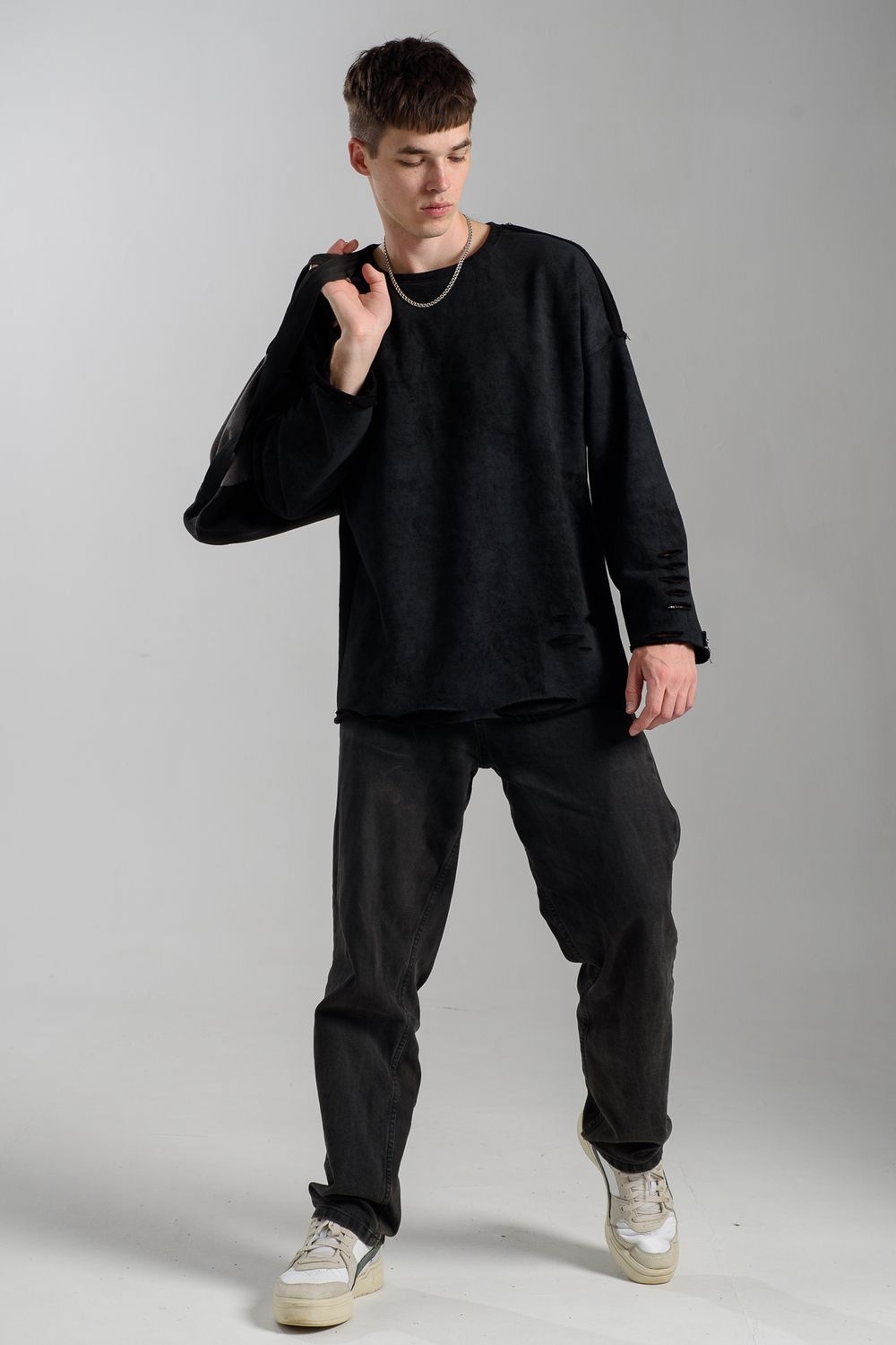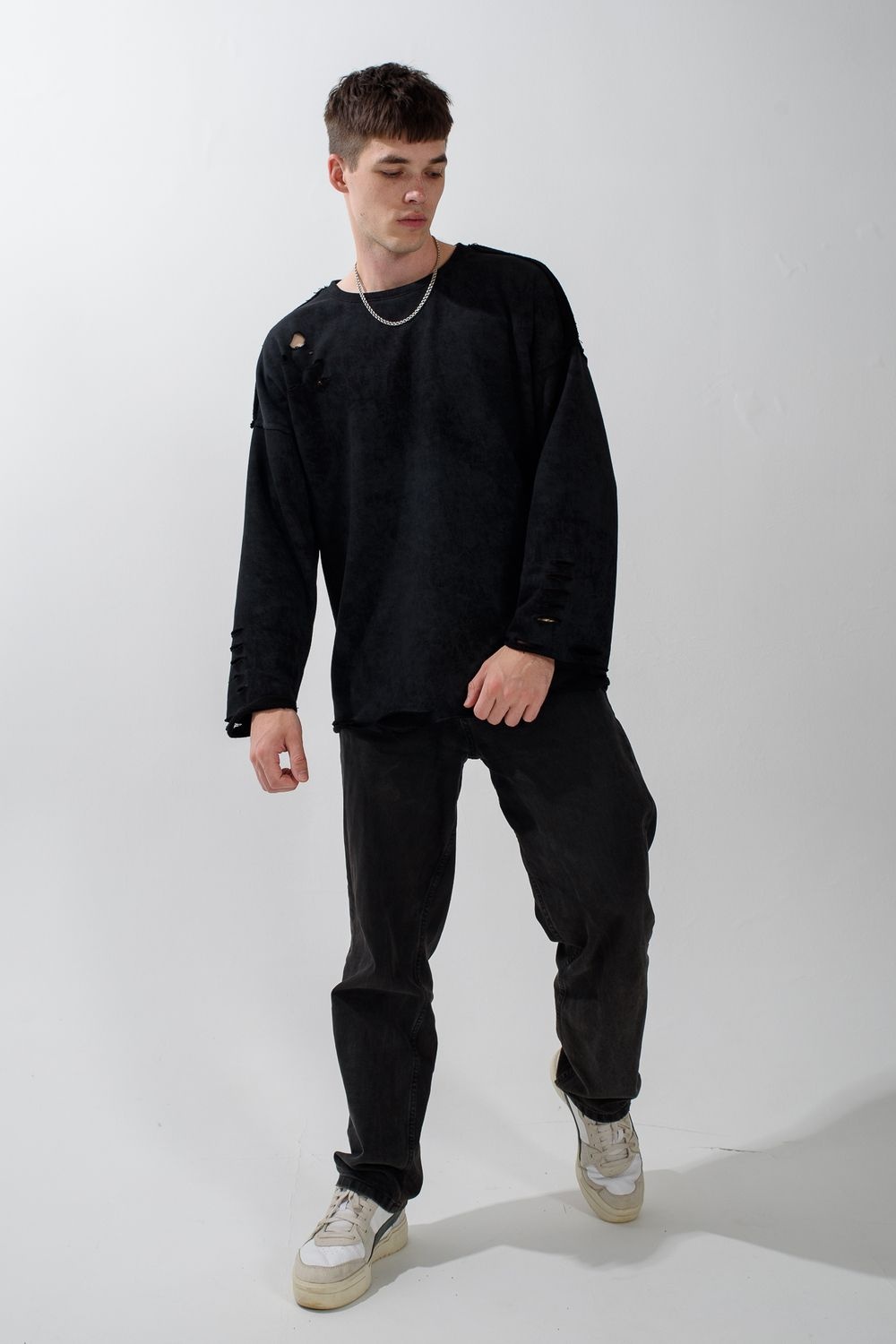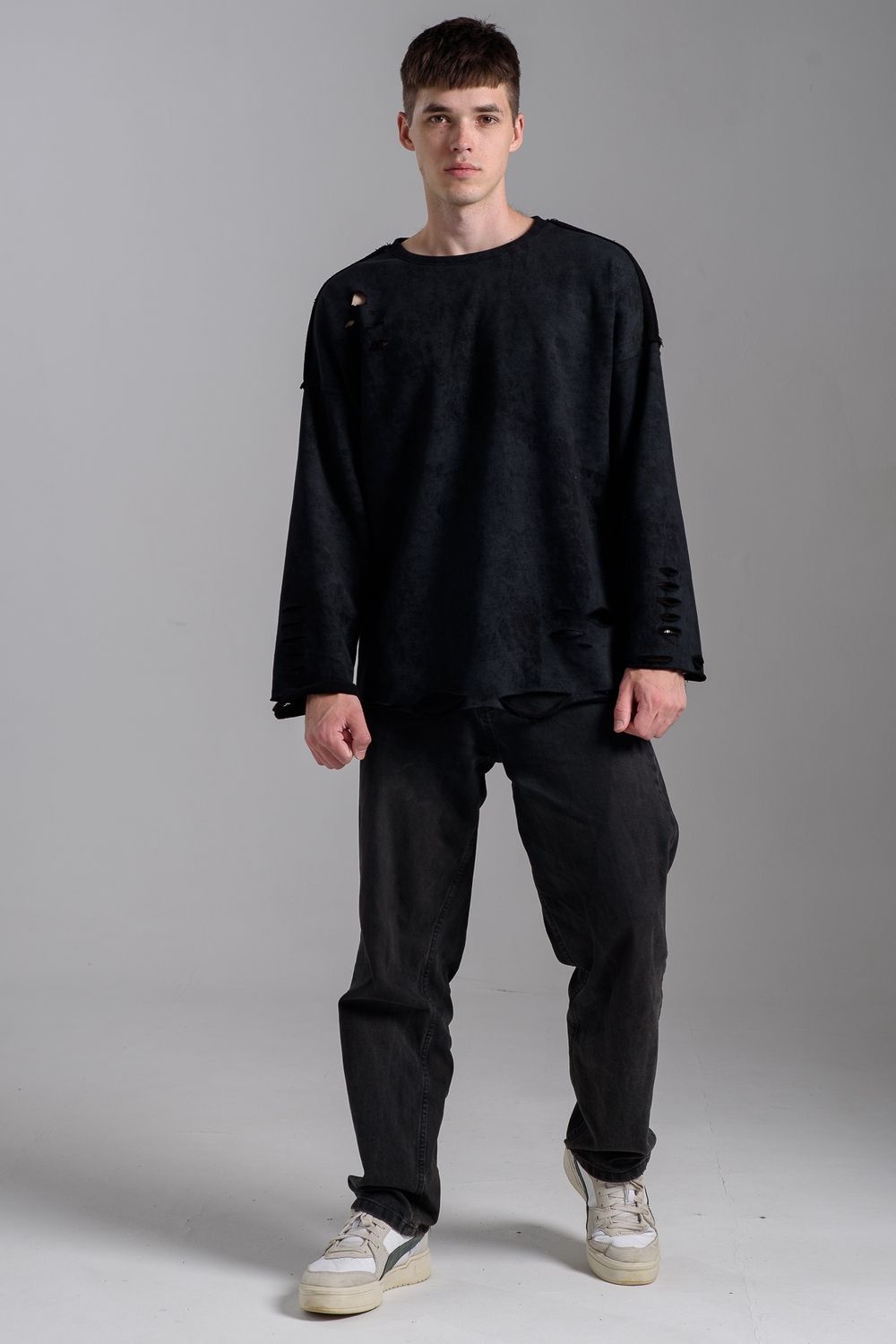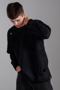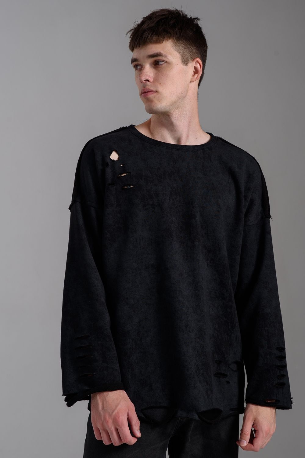 Стильный мужской свитшот в современном дизайне станет отличным дополнением к вашему гардеробу. Изготовлен из мягкого трикотажа, обеспечивает комфорт и тепло прохладными летними вечерами и осенью. Отличается характерной рваной текстурой, что придает ему необычный и оригинальный вид. Легко сочетать с другими элементами одежды. Конструкция рваного свитшота с широкими спущенными плечами и свободным кроем создает расслабленный оверсайз силуэт, что идеально подходит для кэжуал образов. Вырез горловины выполнен в классическом стиле, добавляя простоты и элегантности. Детали дизайна включают в себя необычные прорези, которые подчеркивают гранжевую эстетику. Прекрасно подойдет как для мужчин, так и для женщин, благодаря своему унисекс крою. Также будет уместен в молодежной моде и станет отличным вариантом для создания парных образов.