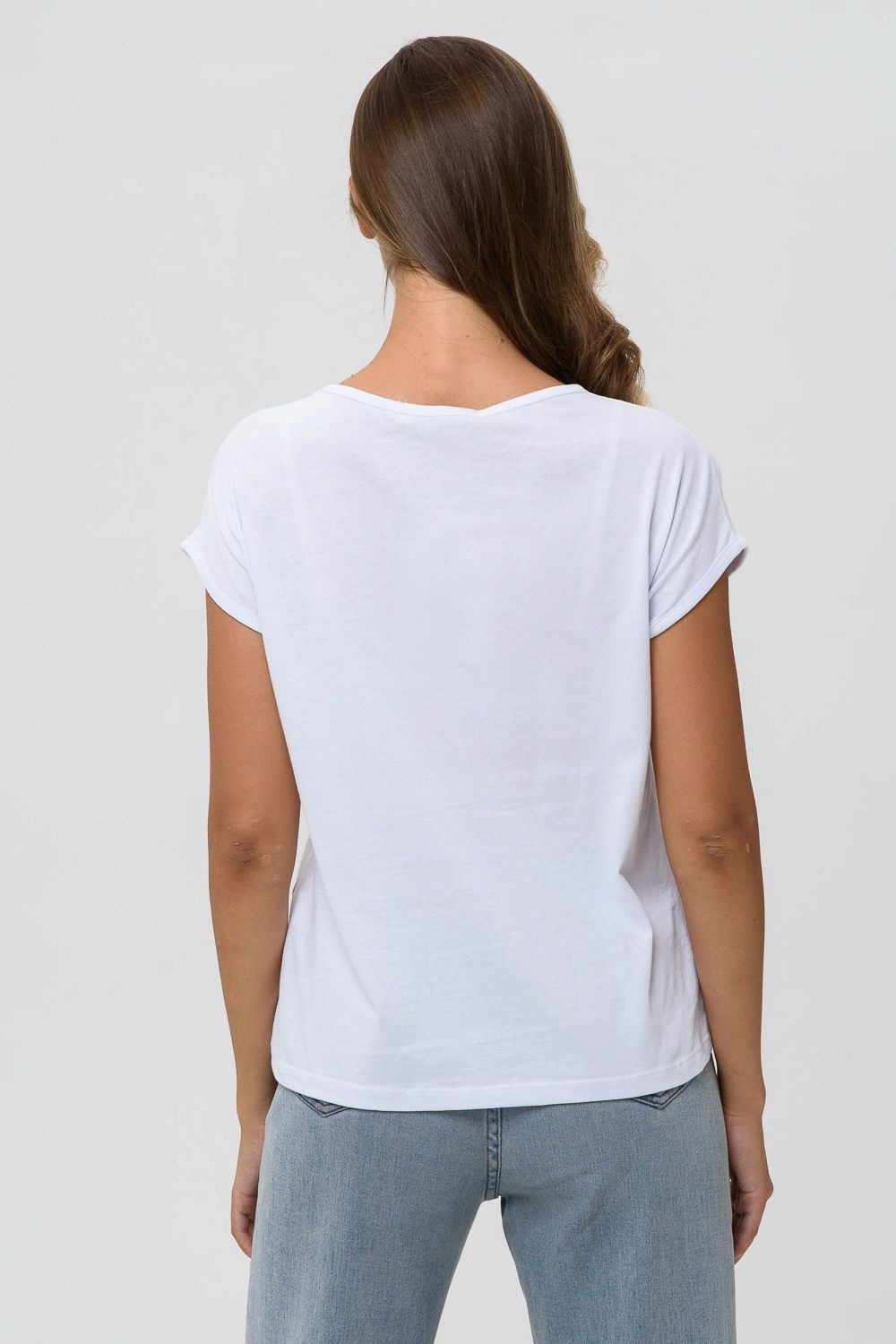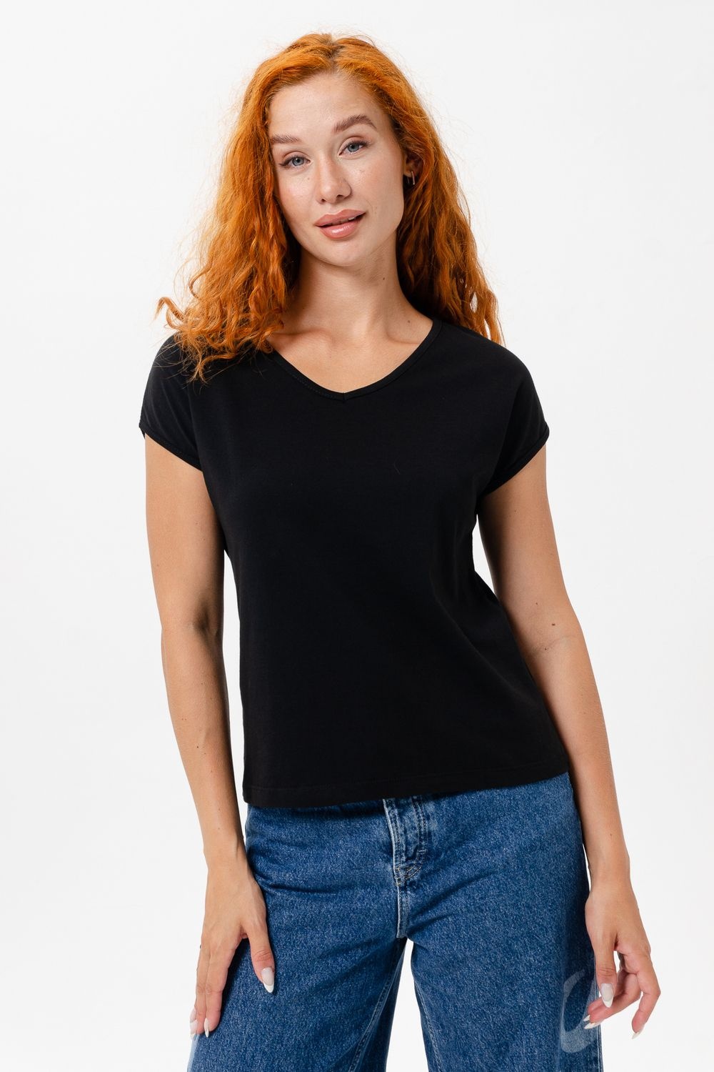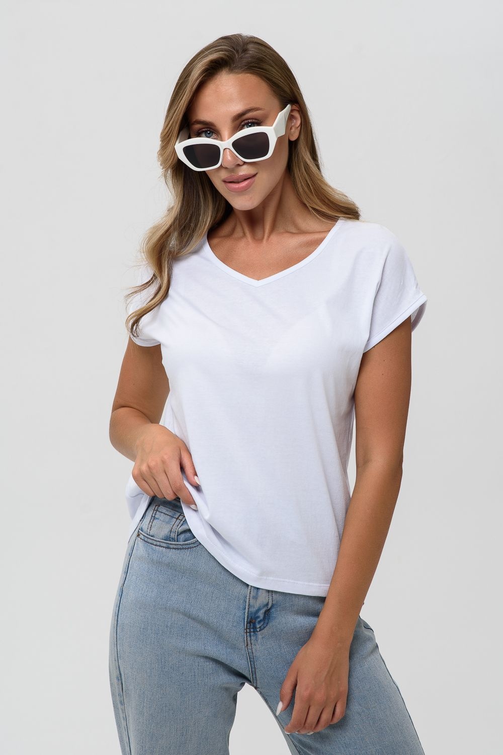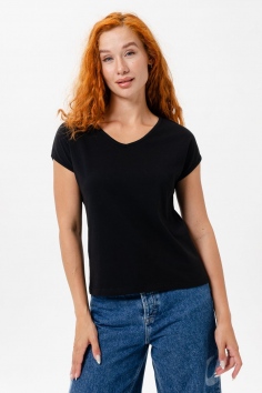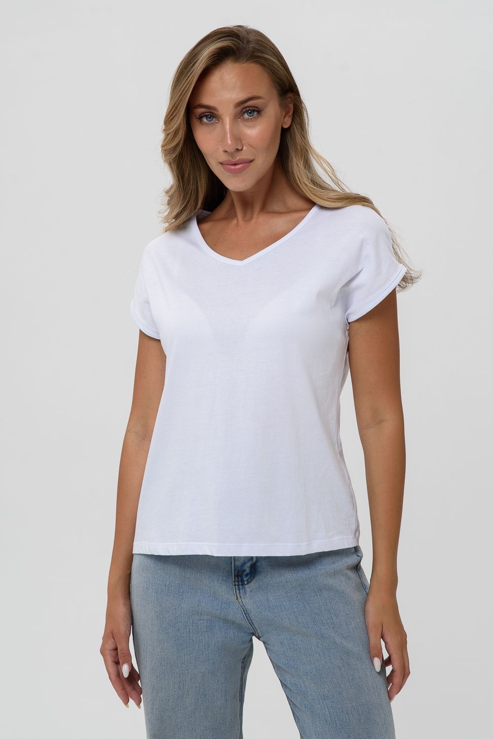 Футболка полуприлегающего силуэта, средней длины, с V-образной горловиной. Рукав цельнокроеный, короткий. Горловина и пройма обработаны бейкой из основного полотна.
