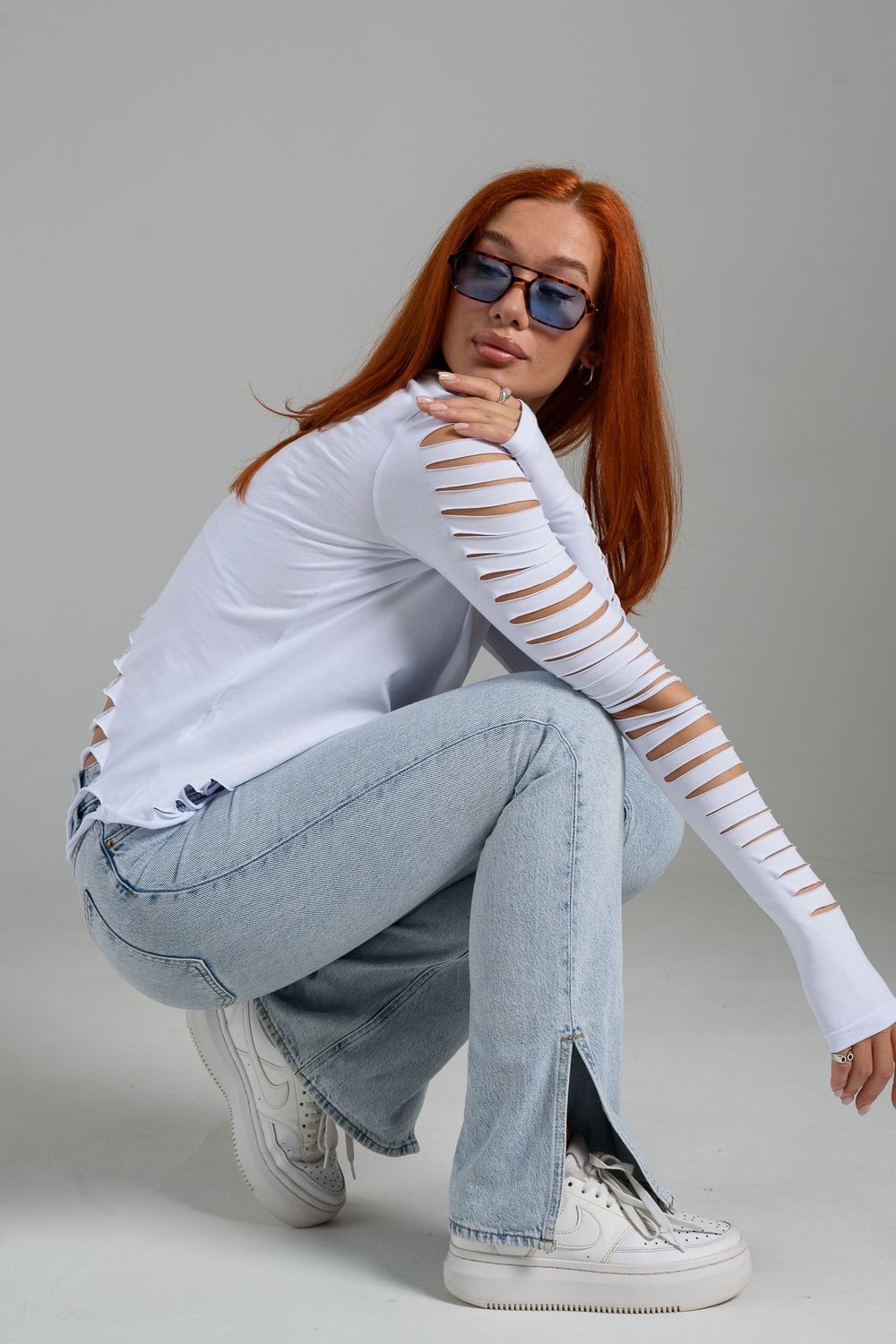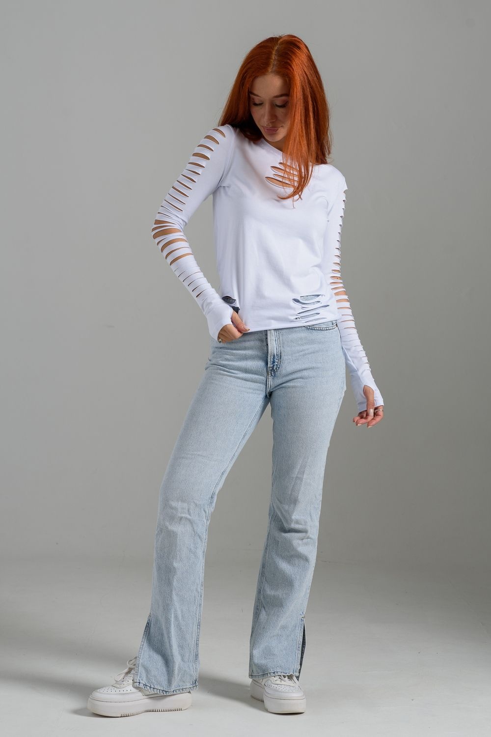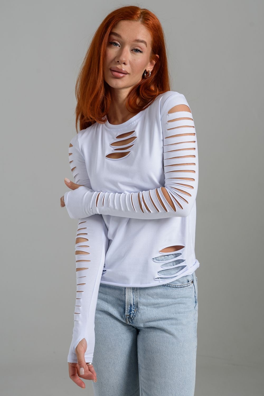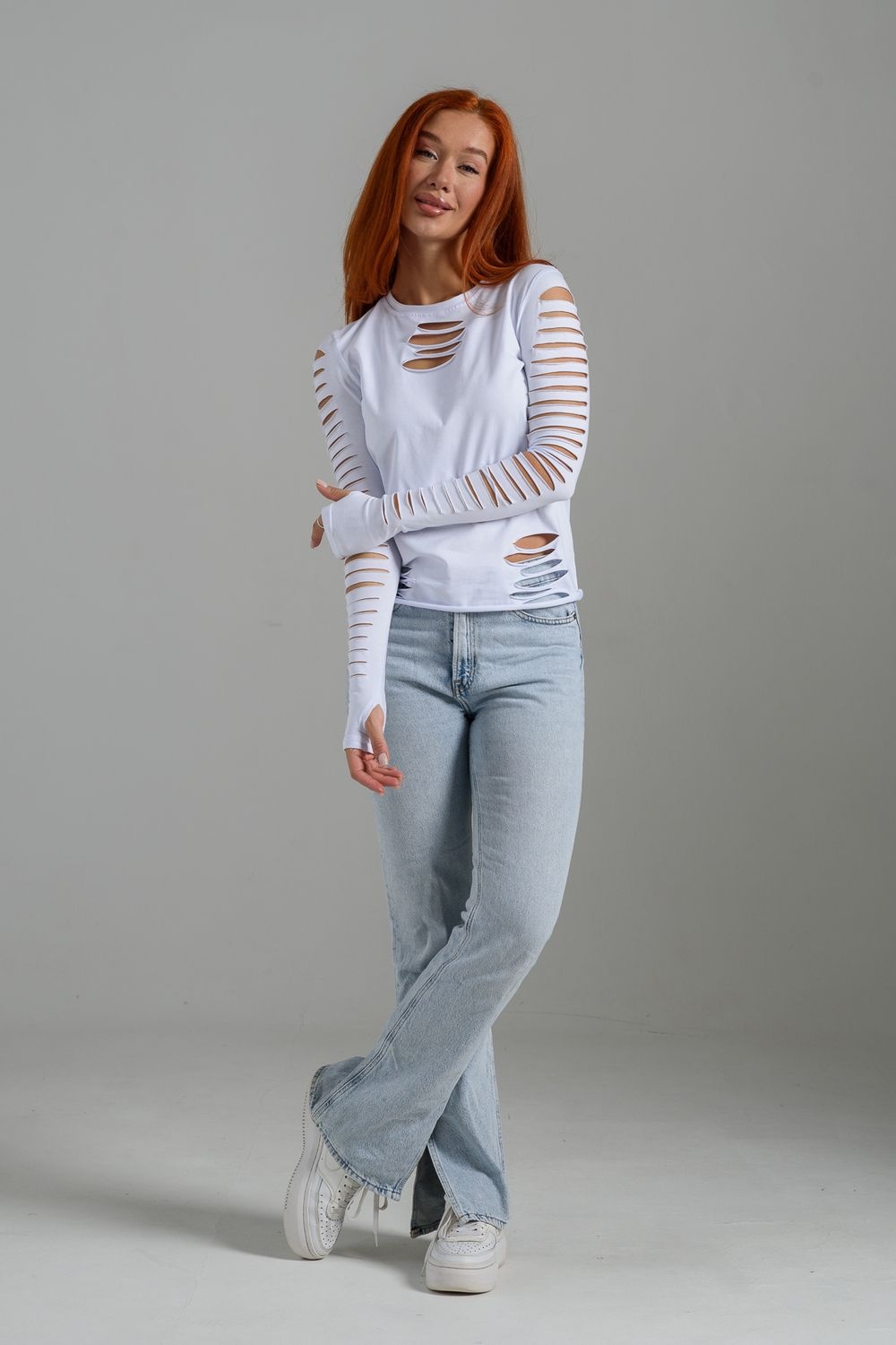 Женский лонгслив с длинными рукавами с из качественного хлопкового трикотажа. Необычный дизайнерский лонгслив с декоративным разрезами станет ярким дополнением к Вашему образу.