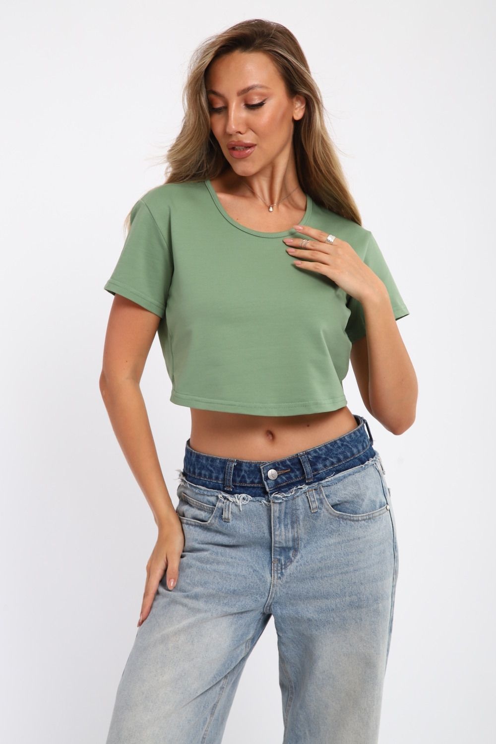 укороченная футболка женская - олива №Н-83908