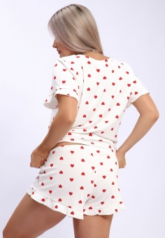 Эта уютная пижама состоит из мягкой футболки и шортов, выполненных из необычного материала, напоминающего лапшу. На принте изображены яркие красные и черные сердечки, создающие игривый и романтичный образ. Дополняет дизайн коричневый леопардовый узор, придающий комплекту стильный и дерзкий вид. Идеальный выбор для комфортных ночных и домашних образов, сочетая оригинальность и уют.