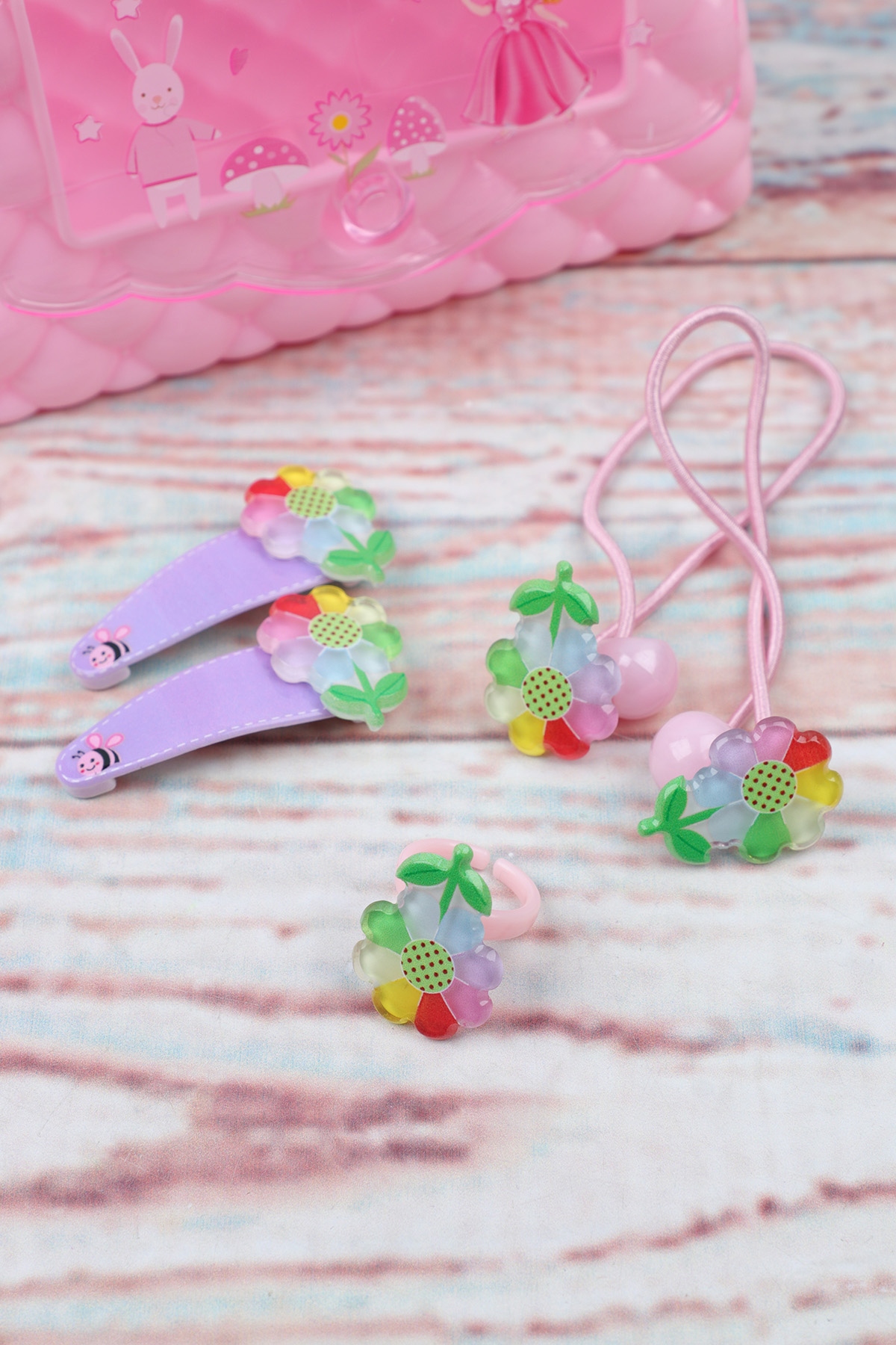 Набор детской бижутерии для девочки в сумочке. В набор входят: две резинки, две заколки и кольцо. От такого набора любая девочка будет в восторге. Он будет отличным подарком.