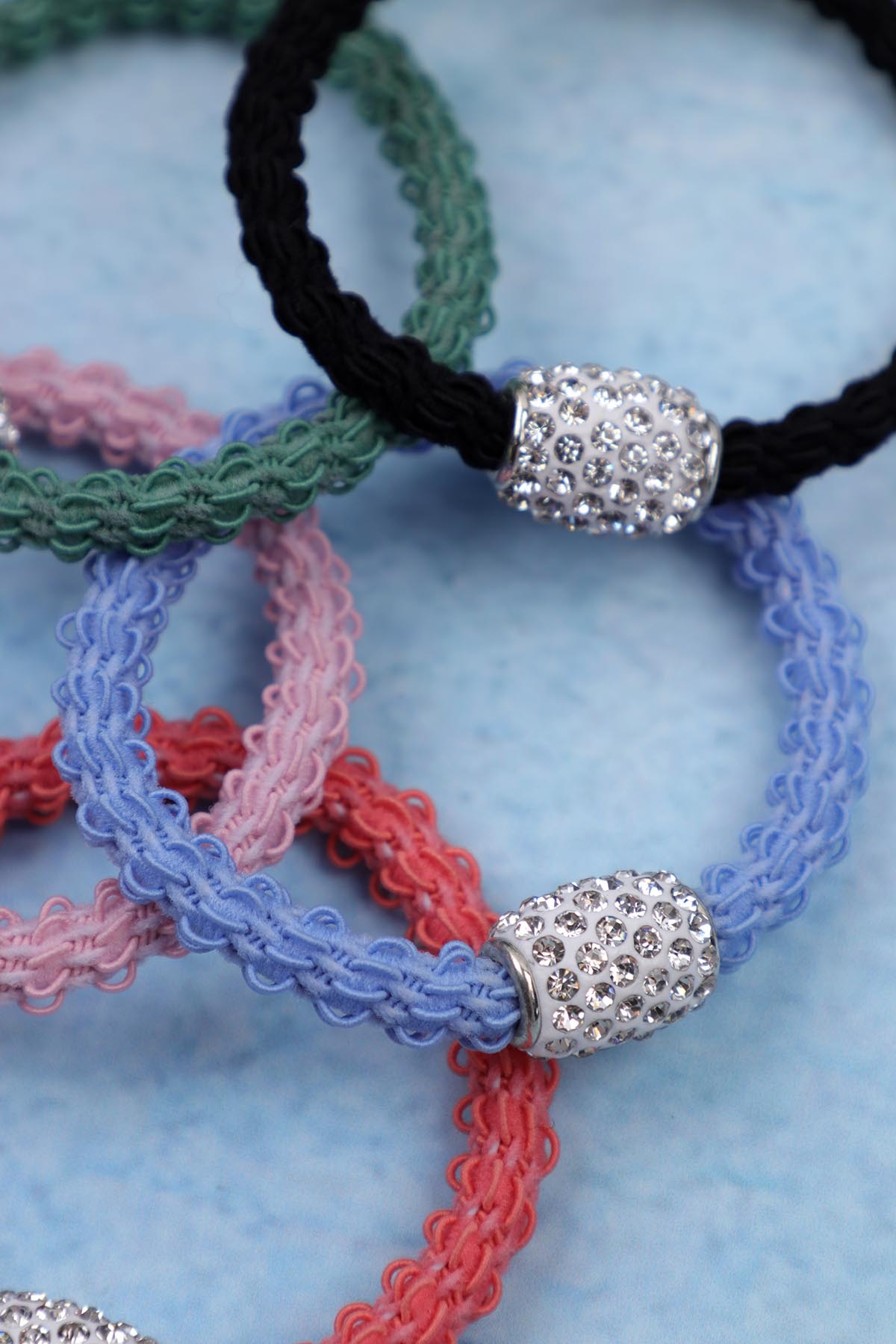 Однотонная резинка для волос украшенная стразами.
