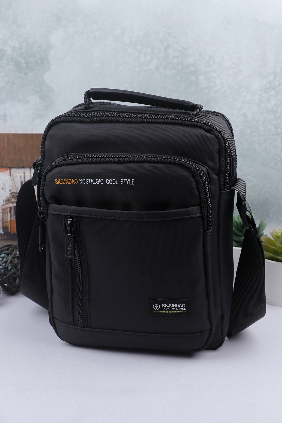 Сумка мужская имеет два отдела на молнии. Внутри два кармана (один из них на молнии). Спереди три кармана на молнии. Сзади карман на молнии. Имеется ручка, чтобы носить сумку в руке или вешать на крючок и несъёмный регулируемый ремешок.