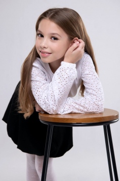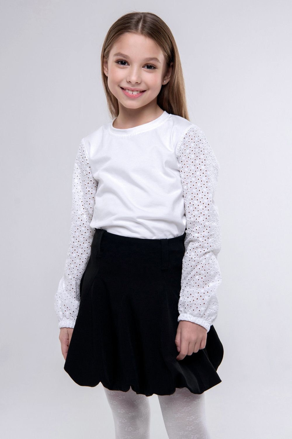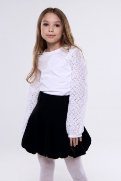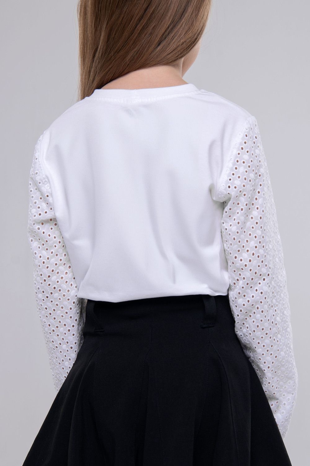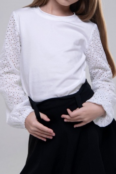 Элегантная белая блузка с ажурными рукавами – стильный выбор для школы и особых случаев. Удобная и изящная, она добавит утонченности любому образу.