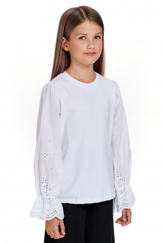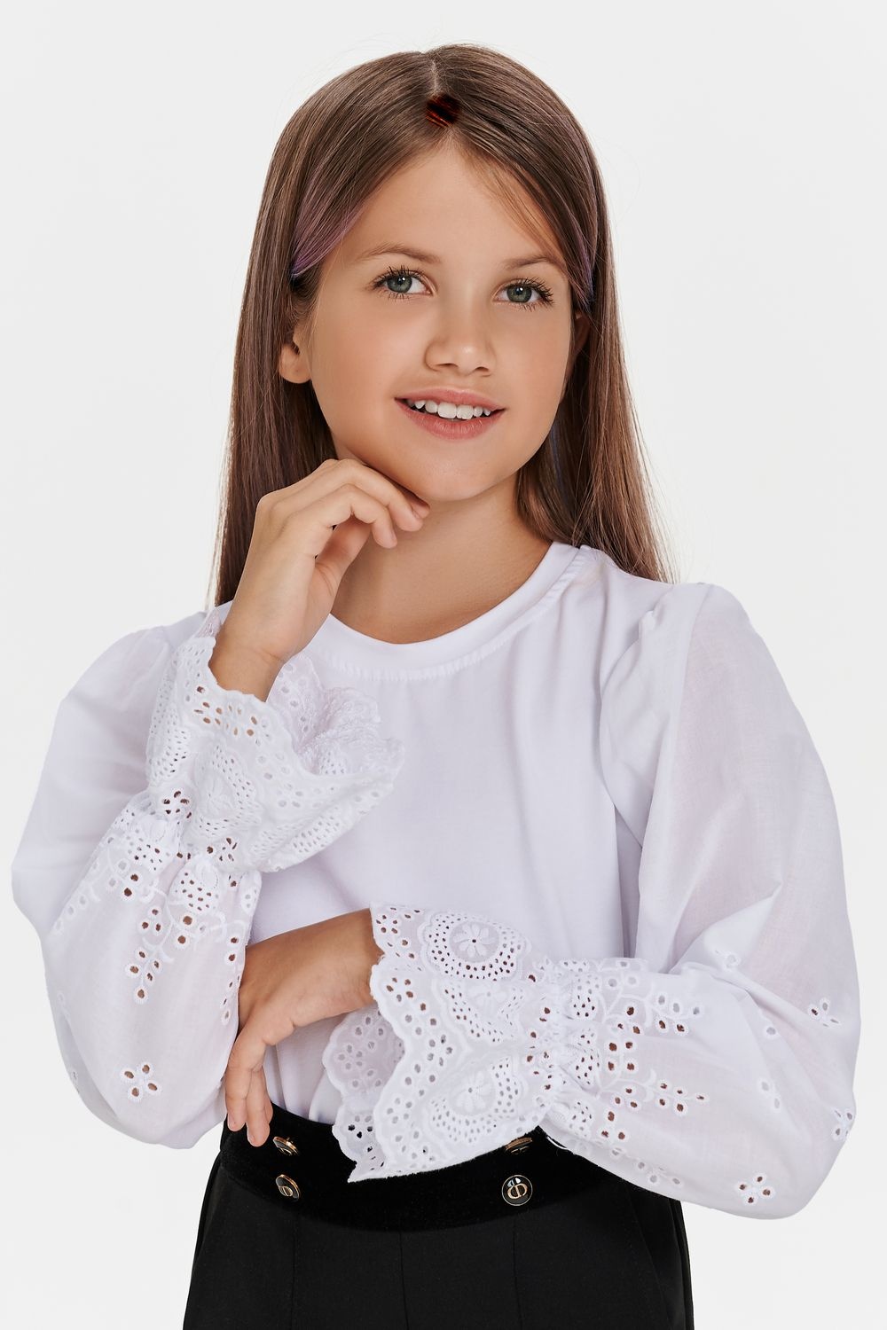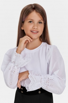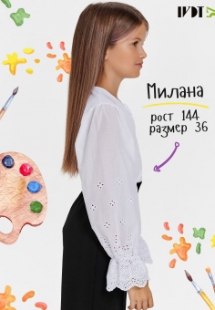 Блузка для школы летняя, которая будет смотреться хорошо и на обычном уроке, и на праздничной линейке. Лаконичная и минималистичная блуза - основа гардероба школьной одежды для девочки и прекрасный вариант на каждый день. Фасон предполагает простой крой и полуприталенный силуэт, Нежные ажурные узоры на рукавах делают эту блузку такой красивой и нарядной!