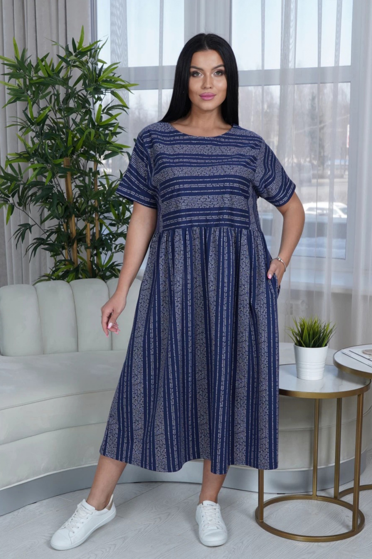 Элегантное платье с короткими рукавами, без застежки, с карманами и длиной ниже колена, с широким силуэтом и завышенной талией. Свободная и стильная платье может стать частью повседневного гардероба. Ткань изготовлена из экологически чистого сырья, имеет высокую воздухопроницаемость, хорошо впитывает влагу.