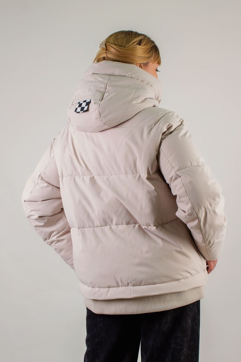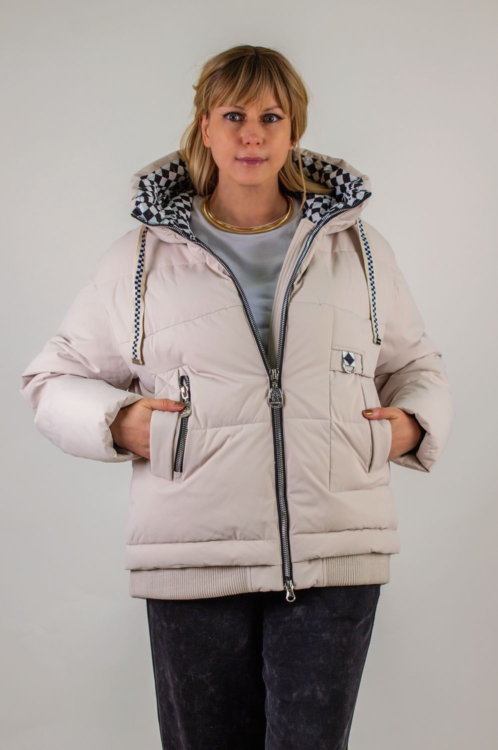 • Капюшон: объёмный, с регулировкой по глубине и окантовкой контрастным шнуром. Внутренняя отделка капюшона – оригинальный чёрно-белый шахматный принт, придающий модели дерзкий, игривый характер.