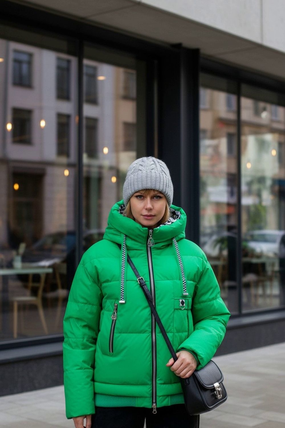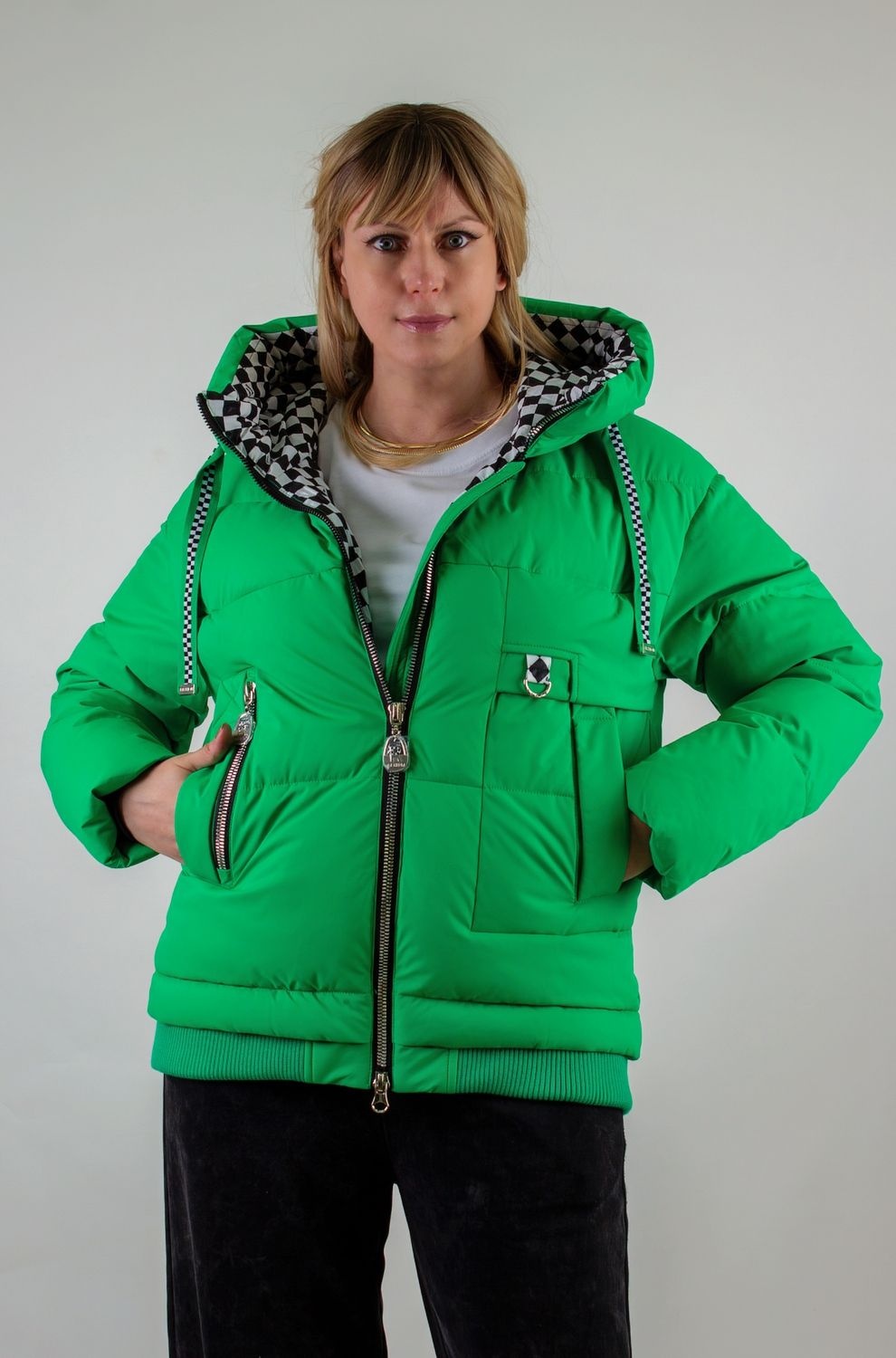 • Капюшон: объёмный, с регулировкой по глубине и окантовкой контрастным шнуром. Внутренняя отделка капюшона – оригинальный чёрно-белый шахматный принт, придающий модели дерзкий, игривый характер.
