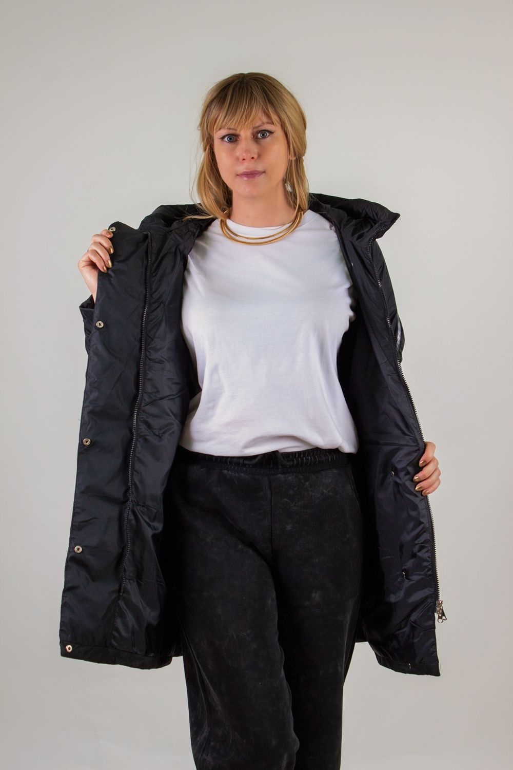 Горизонтальная простежка придает изделию визуальную легкость. Благодаря ей куртка сохраняет идеальную форму, не теряя элегантности, а наполнитель обеспечивает оптимальный уровень теплоизоляции без излишнего веса. Общая длина 88 см закрывает бедра, создавая стройный силуэт и надежно защищая низ спины от холода.