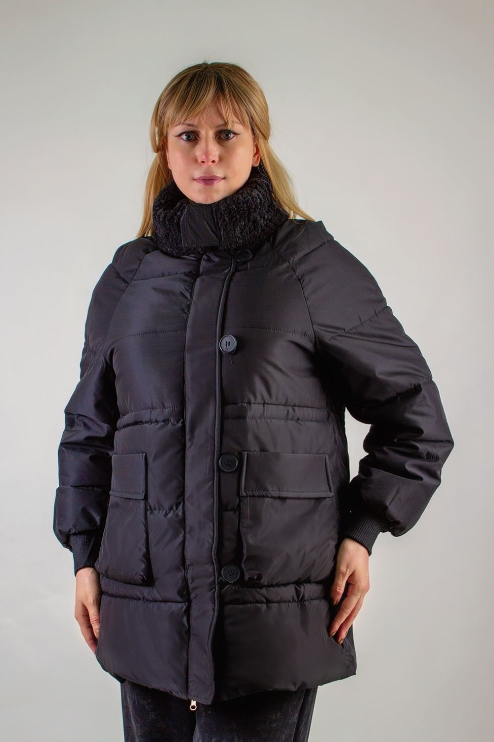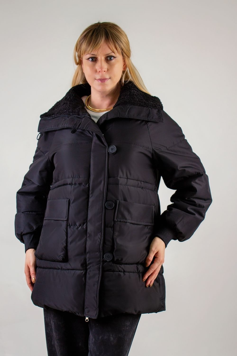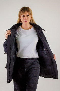 1. Воротник-стойка с отделкой из искусственного меха «под барашка» в тон основного материала: мягкий, приятный на ощупь, не требует особого ухода и не теряет формы.
