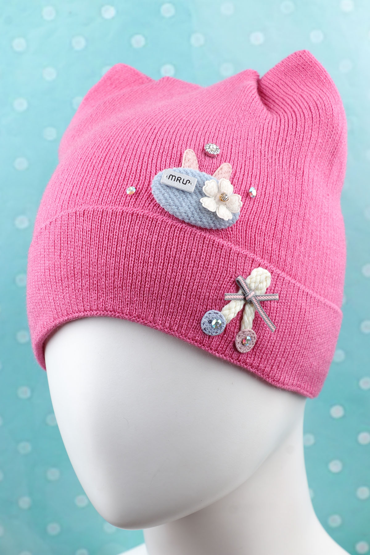 Тёплая шапка на девочку двойная с отворотом утеплена флисовой подкладкой. Внешний отворот дополнительно согревает уши. Хорошо облегает голову и комфортно сидит. Шапка украшена небольшой аппликацией.