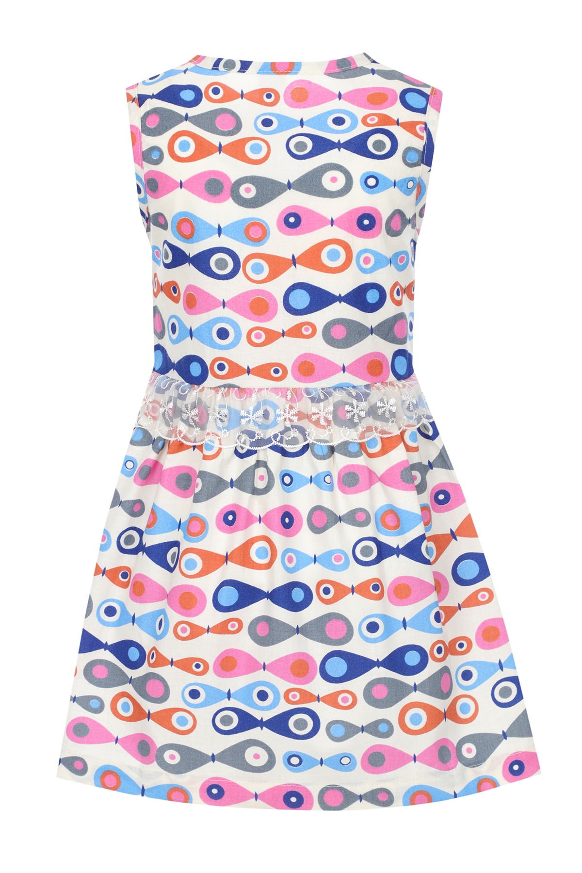 Платье детское летнее на трёх пуговицах спереди, без рукавов, с круглым вырезом горловины. Платье приталенного силуэта с расклешённой юбкой в складочку.