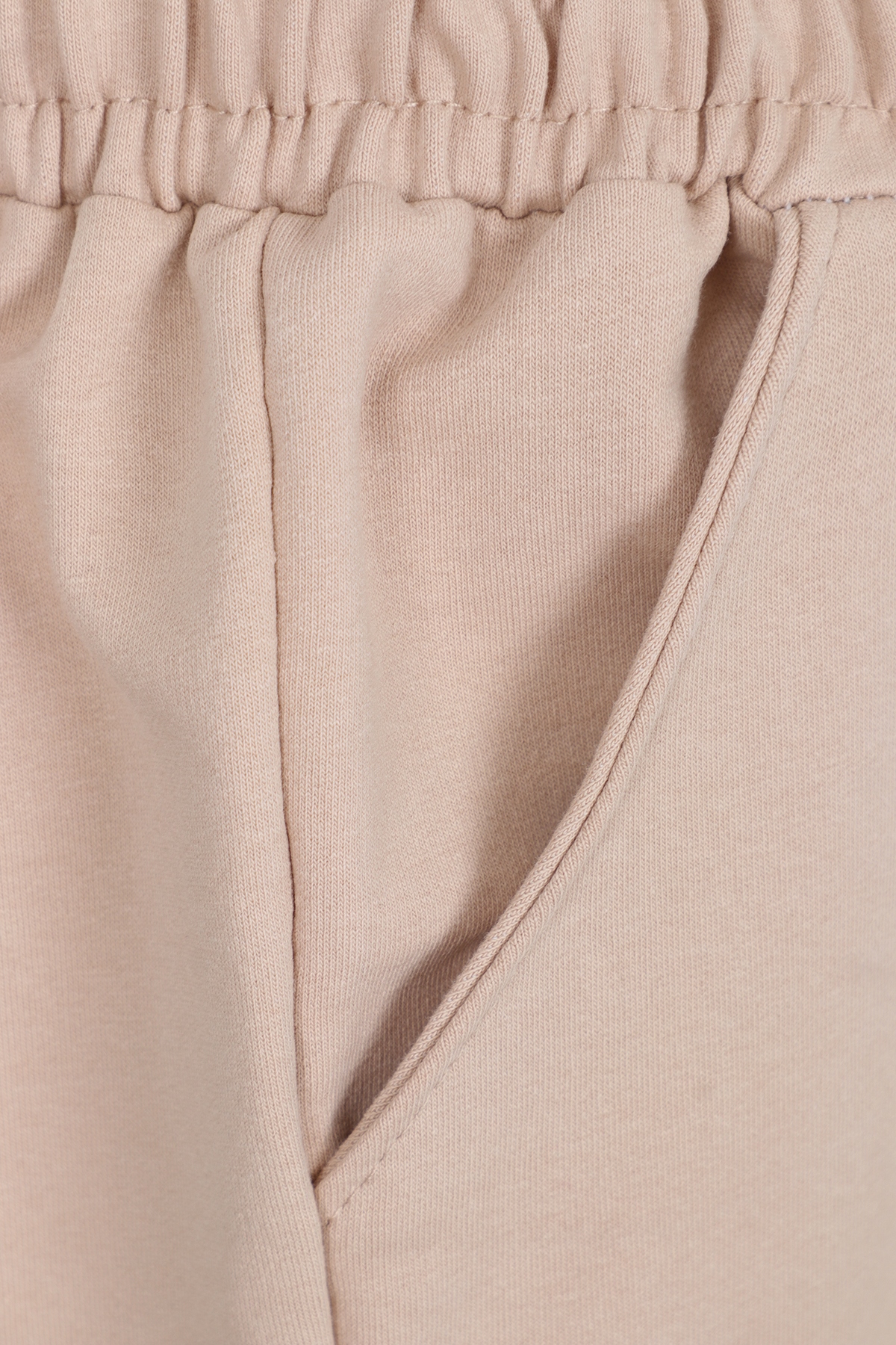 В поясе у штанов широкая эластичная резинка и шнурки. Низ на эластичных манжетах, по бокам карманы.