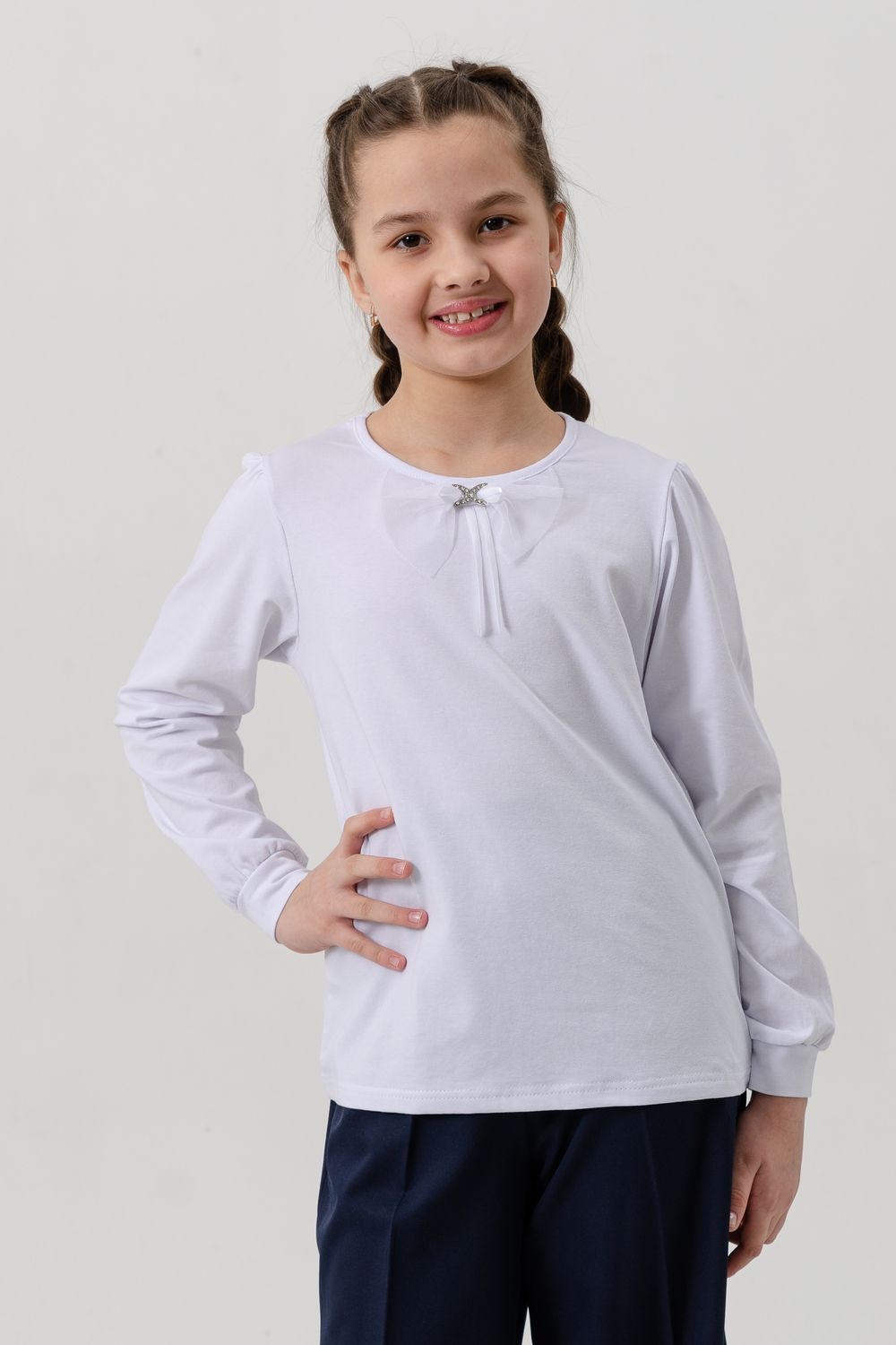 Блузка школьная для девочки с трикотажными длинными рукавами, круглым вырезом горловины, без застёжки, прилегающего силуэта, по центру переда настрочен бант из сетки, спереди прикреплен съёмный декоративный элемент, рукава на манжетах. Сшита из однотонного мягкого хлопкового трикотажного материала с добавлением в состав хлопка 92% и лайкры 8%. Школьная форма украсит и дополнит любой образ не только в школу, но и для повседневной носки, на день рождения, фотосессию и для особых случаев. Блузка отлично сидит по фигуре, движения в нем комфортные, позволяет выглядеть ребенку изящно. Хорошо смотрится в сочетании с юбками, сарафанами, брюками, со школьным костюмом, отлично сохраняют цвет и форму при активной носке и после многократных стирок. Используемый материал блузки мягкий и приятный телу, устойчив к износу, не садится, не образует катышек на поверхности, имеет эффектный внешний вид.
