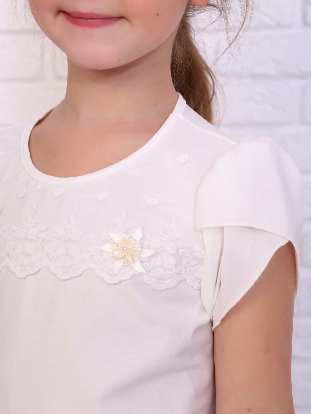 Джемпер для девочки из трикотажного полотна кулирка с лайкрой с коротким рукавом. Джемпер полуприлегающего силуэта, с втачным рукавом из шифона, без застежки. Спереди на кокетке настрочено кружево, прикреплен декоративный элемент. Рукав короткий, из двух частей, присборенный по окату. Низ рукавов обметан на краеобметочной машине. Низ изделия подогнут. Срез горловины обработан узкой окантовочной лентой из того же полотна.