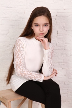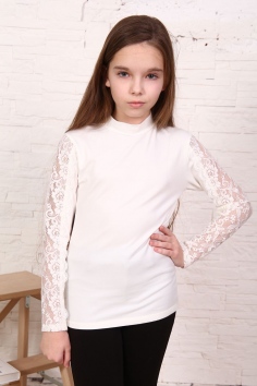 Блузка для девочек младшего и старшего школьного возраста, из однотонного трикотажного полотна кулирка с лайкрой. Блузка полуприлегающего силуэта, с втачным рукавом, без застежки, с воротником - стойкой. Спереди и на спинке отсутствуют линии членения. Рукав одношовный с кружевной вставкой, длинный. Низ рукава без манжеты, подогнут.