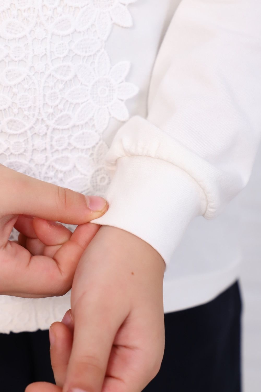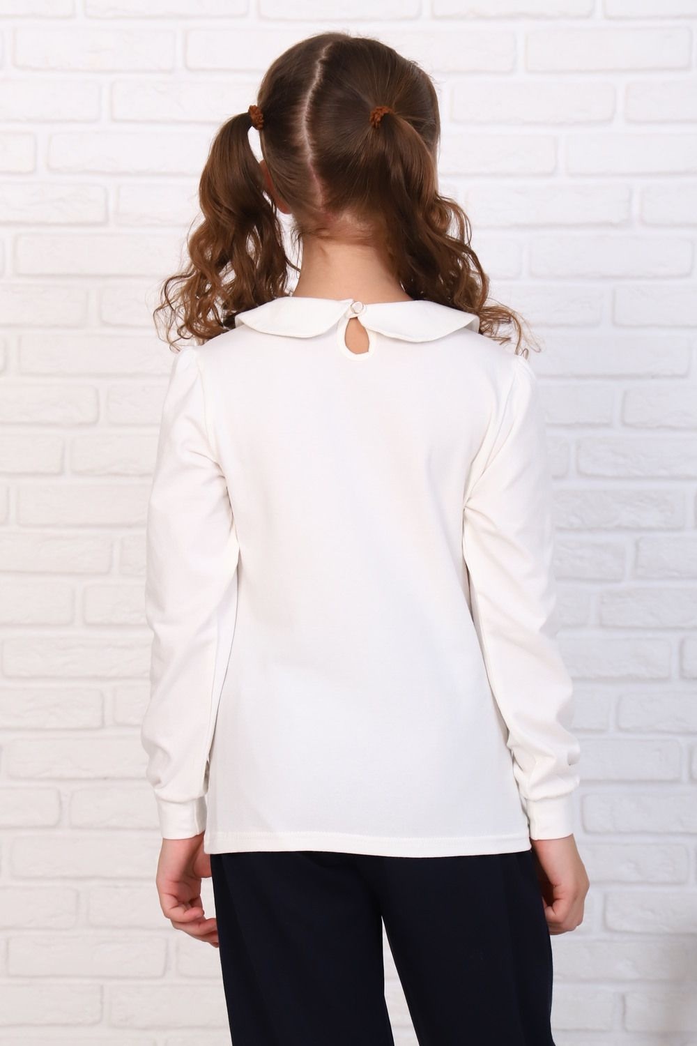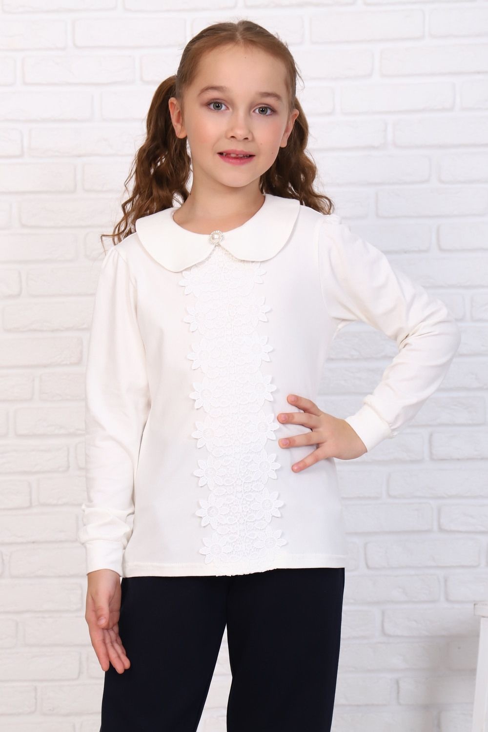 Базовая школьная блузка для девочек с длинным рукавом. Отложной круглый воротник сзади застежка-пуговка. Нарядная блузка станет основой повседневного и праздничного образа. Мягкое кружево от верха до низа изделия придает модели нежности. Модель составит одинаково удачный комплект и с юбкой, и с брюками. Блузка сшит из качественного трикотажа, используемый материал не теряет форму после многократных стирок, мягкий и приятный к телу, устойчив к износу. Для сохранения первоначальных свойств изделия, важно соблюдать рекомендации по уходу.