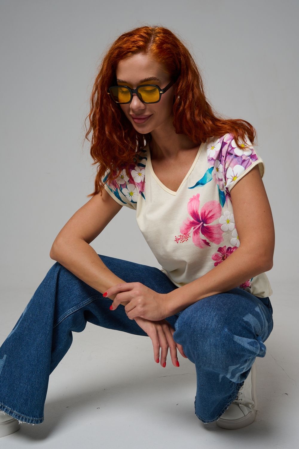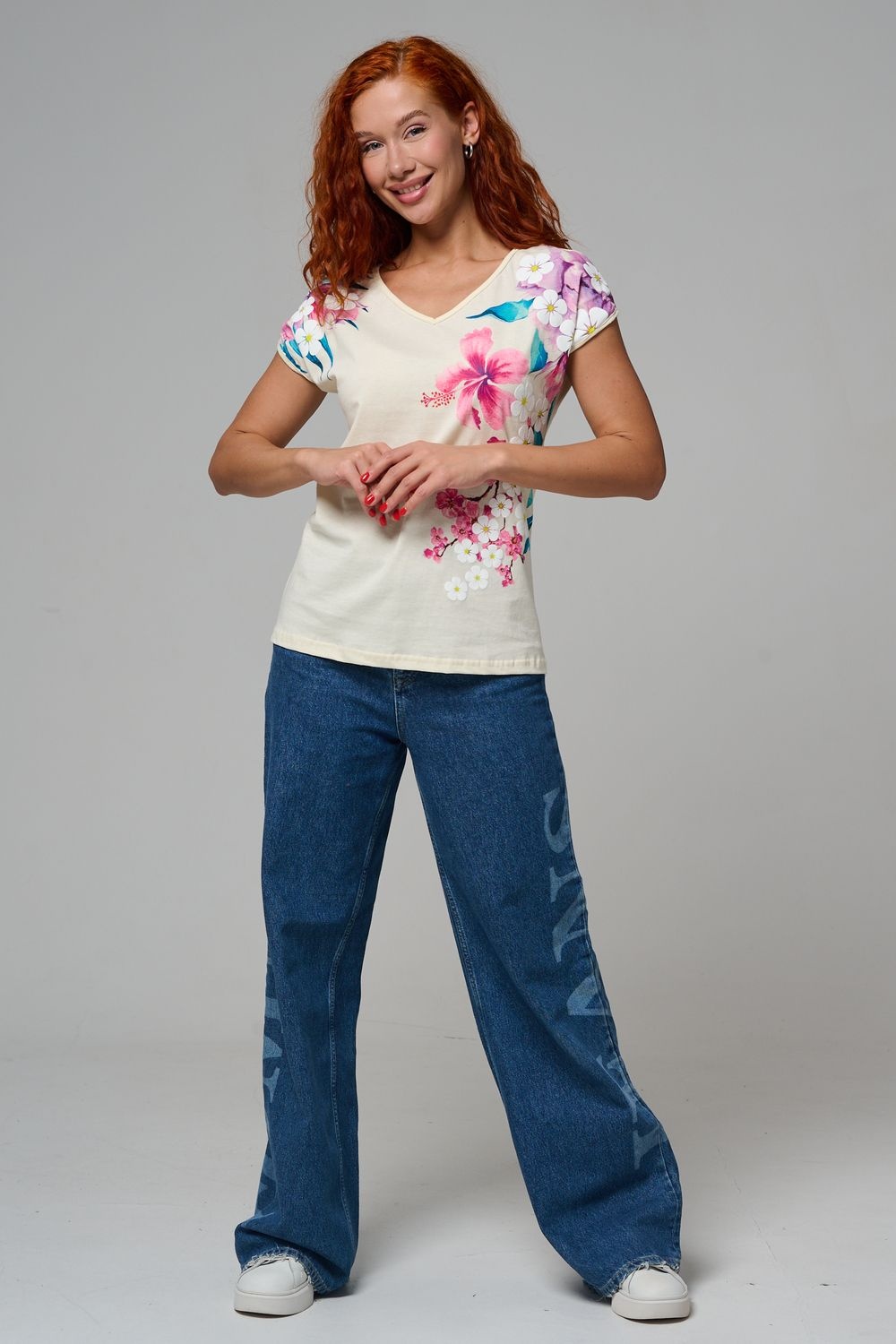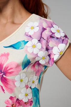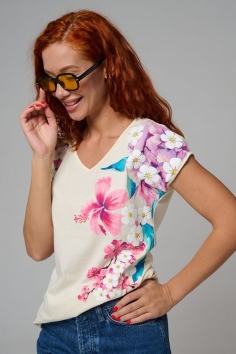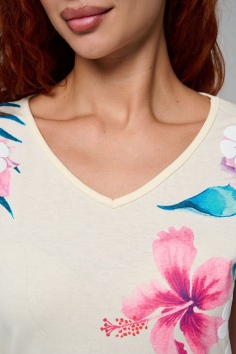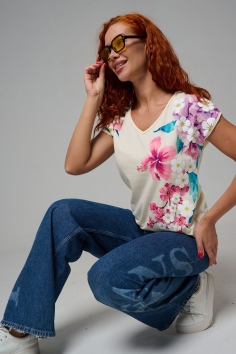 Футболка полуприлегающего силуэта, средней длины, с V-образной горловиной. Рукав цельнокроеный, короткий. Горловина и пройма обработаны бейкой из основного полотна. допустимо различие в цвете от представленного на фото.