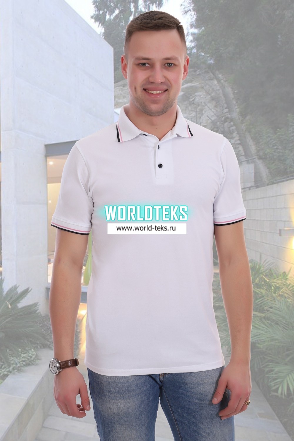 Футболка-поло прямого силуэта для повседневной носки. Отделка - планка с пуговицами, воротник и манжеты вязаные
