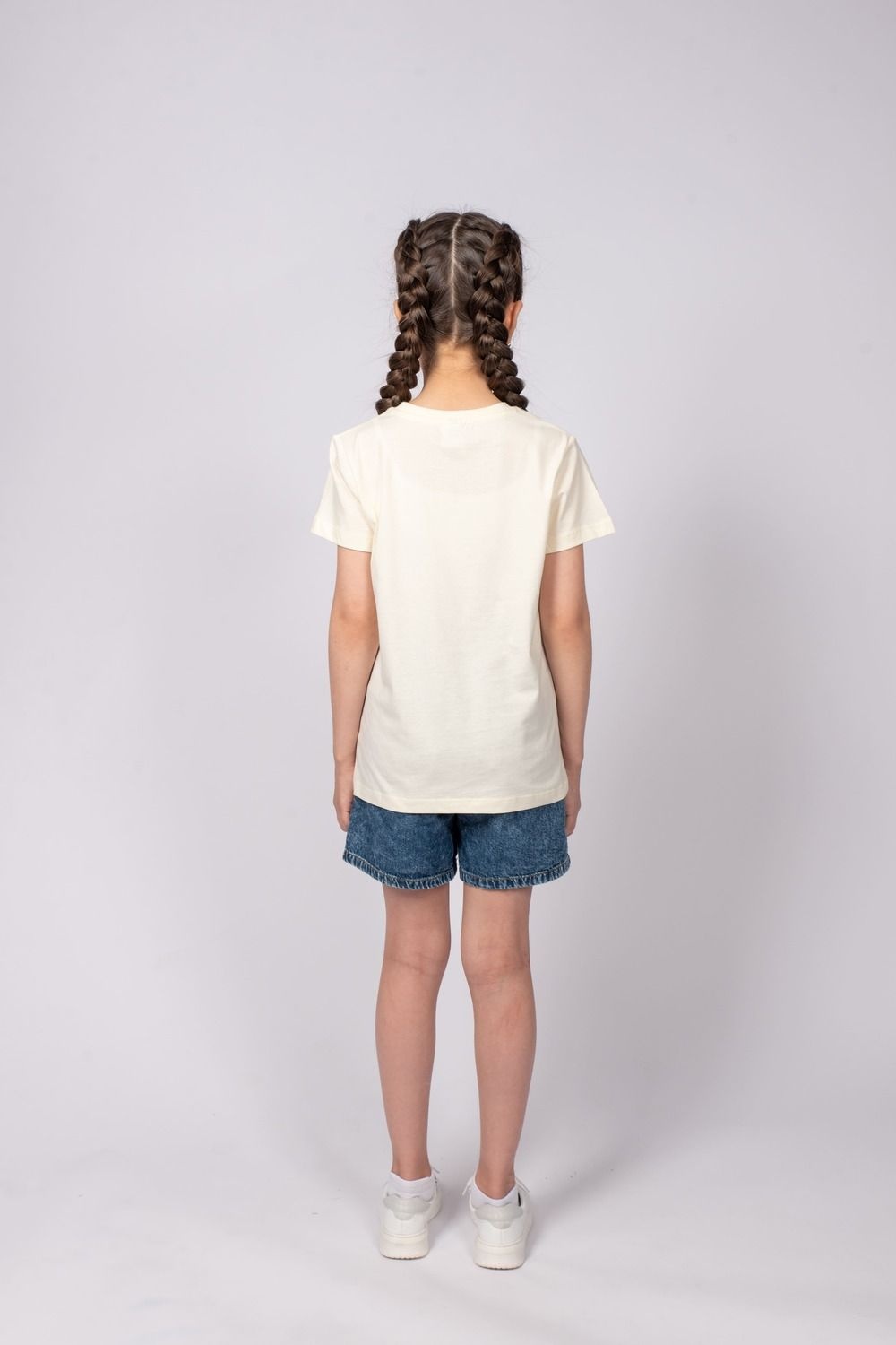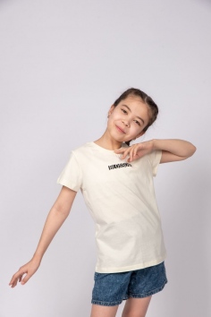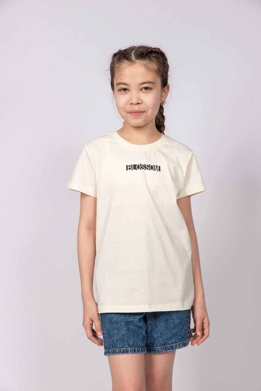Футболка для девочки выполненная из мягкого хлопкового трикотажа, который прост в уходе, позволяет телу дышать и комфортен в носке. Футболка прямого силуэта, с втачным коротким рукавом. Принт Шелкография. Надпись переводится как 'Цвети'. Благодаря эластичной горловине, выполненной из рибаны, футболку удобно снимать и надевать. Материал не растягивается и не деформируется.