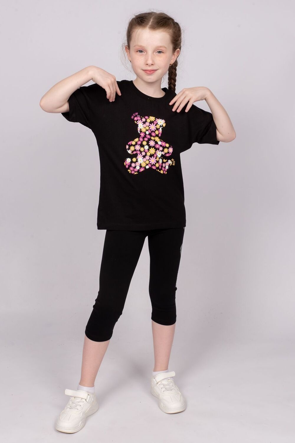 Футболка для девочки прямого силуэта, со спущенным плечом коротким рукавом. Горловина круглая, обработана воротником из рибаны. По горловине полочки отделочная строчка. Низ изделия и рукавов обработан швом в подгибку. На полочке принт Шелкография.