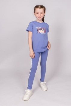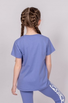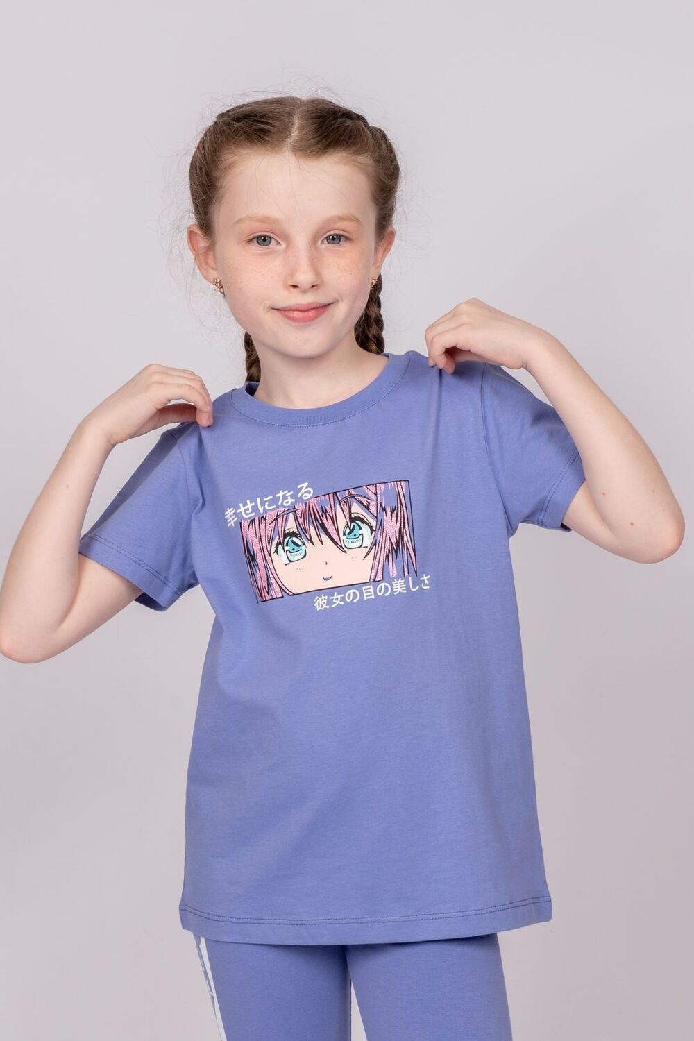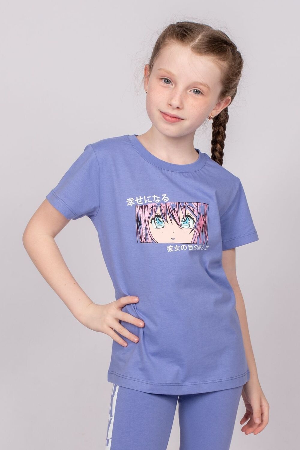 Футболка для девочки прямого силуэта, с втачным коротким рукавом. Горловина круглая, обработана воротником из рибаны. По горловине полочки отделочная строчка. Низ изделия и рукава обработан швом вподгибку. На полочке принт Шелкография с глиттером. Надпись переводится как 'Будь счастлива, красота в её глазах'.