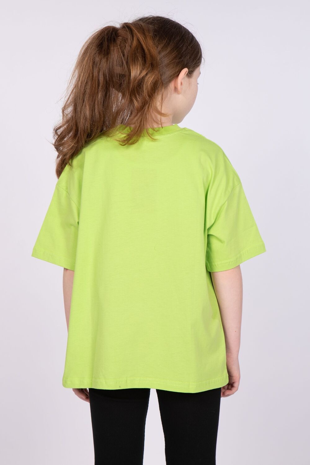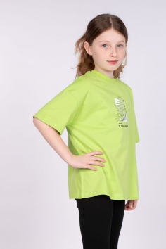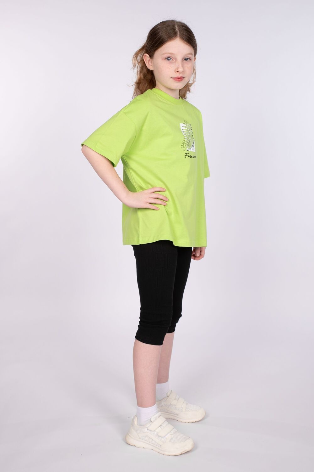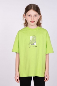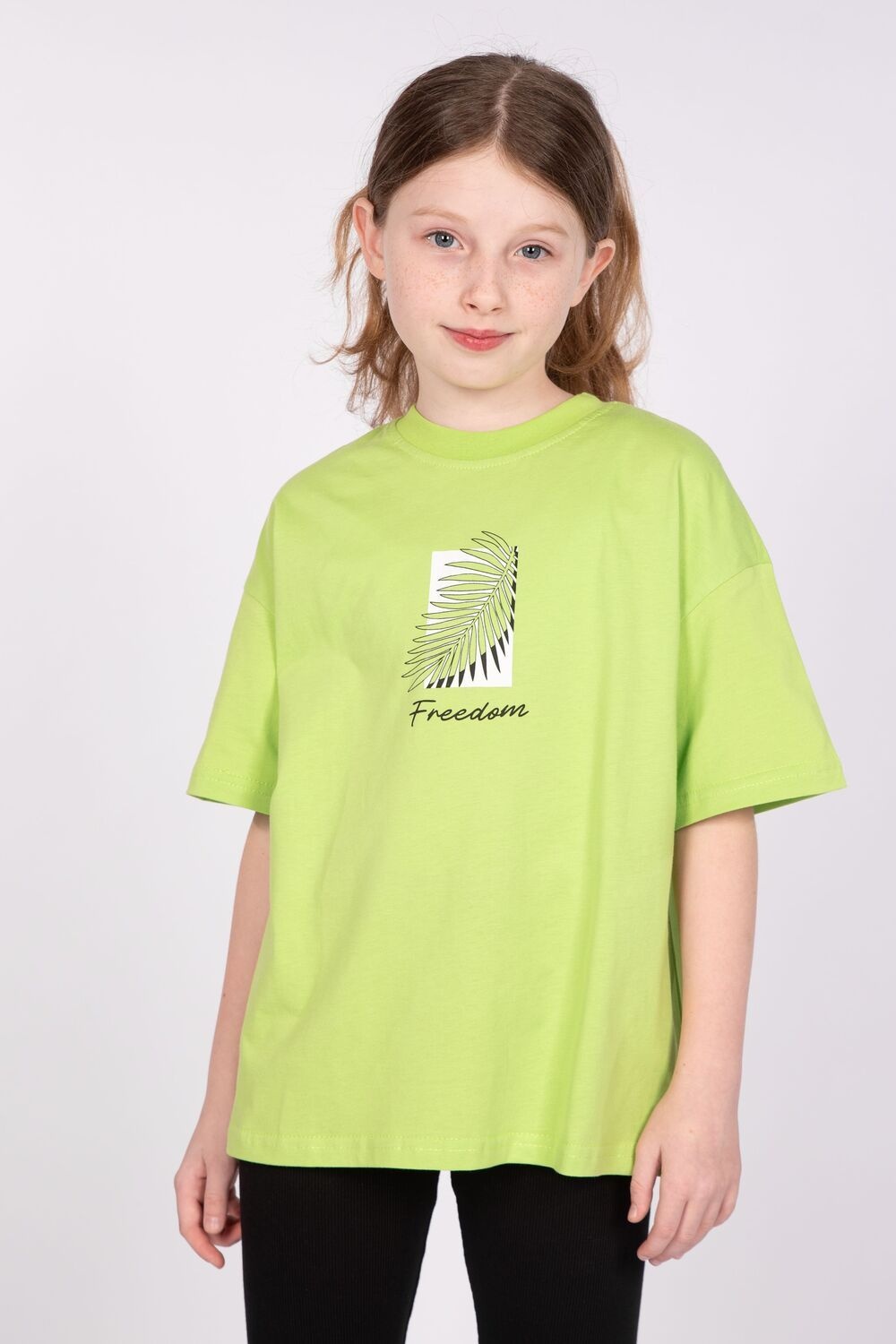 Футболка для девочки свободного силуэта (оверсайз) с коротким рукавом. Горловина круглая, обработана обтачкой из рибаны. Низ изделия и рукава обработаны швом вподгибку. На полочке принт Шелкография. Надпись переводится как 'Свобода'.