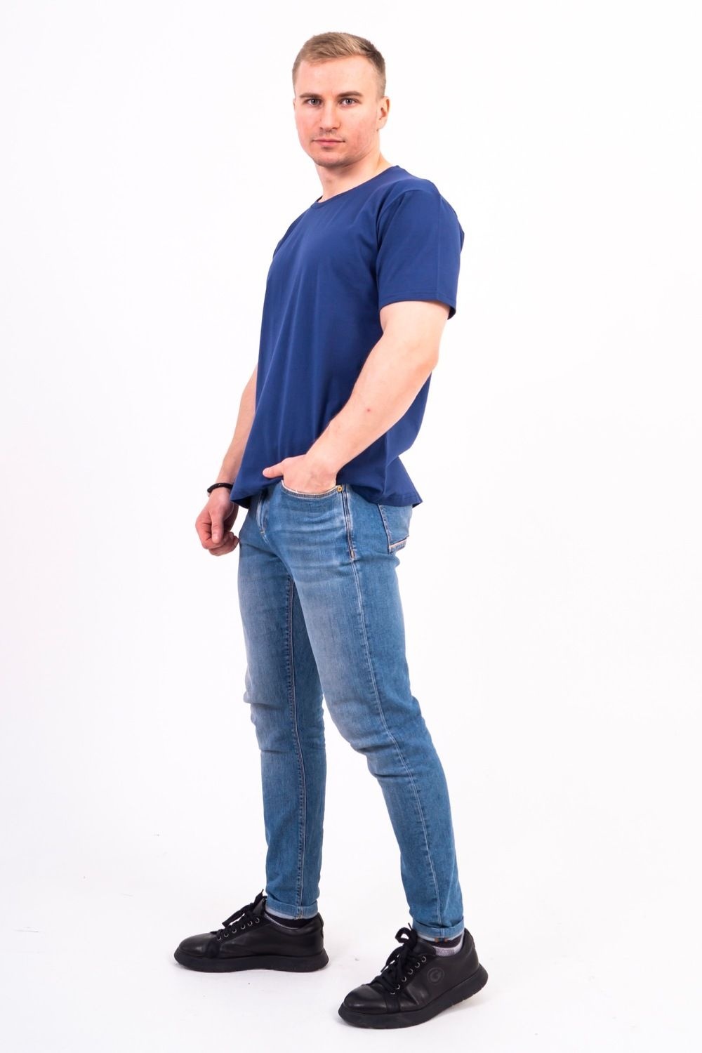 Базовая мужская футболка из кулирки. Хлопковая однотонная мужская футболка классического прямого кроя. Модель отлично подходит разным типам фигур, хорошо сидит и не стесняет движений. Дышащий материал приятен на ощупь и отличается особым комфортом. Базовая футболка универсальна, прекрасно комбинируется с разными предметами мужского гардероба. Ее можно сочетать с джинсами, брюками, шортами. В этой футболке вы в любой ситуации будете выглядеть современно. Горловина обработана рибаной. Росток спинки обработан бейкой из кулирки. Рукав втачной, короткий.