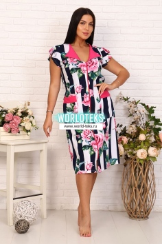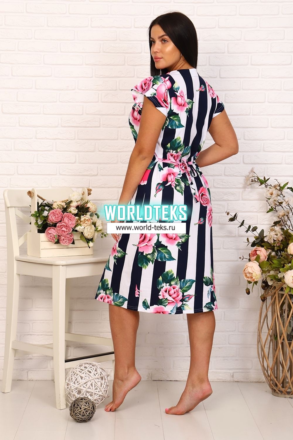 Оригинальный женский халат с красивым принтом на ткани в виде полос и роз. Рукав короткий в форме крылышка, отложной треугольный воротник. Застежка-молния, длина ниже колена.