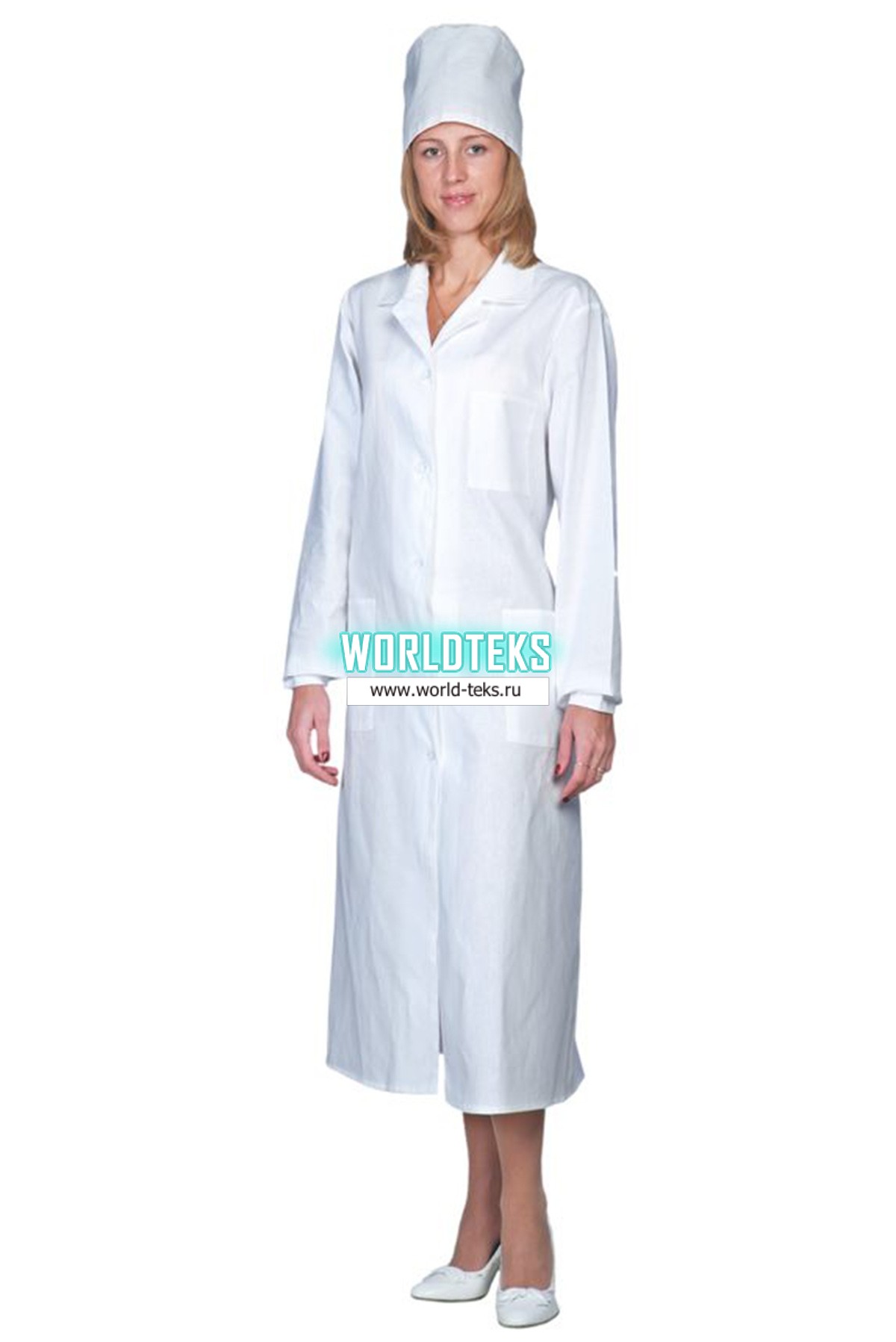 Халат медицинский женский прямого силуэта, длиной ниже колена, выполнен из 100% хлопка. На полочке один нагрудный и два боковых накладных кармана. На спинке два полупояса из боковых швов с застежкой на пуговицу. Рукава длинные с манжетами. Воротник отложной с лацканами. Халат выполнен с центральной бортовой застежкой на пуговицы. Для сборки халата используются нитки в цвет ткани и семь прозрачных пуговиц диаметром 16 мм.