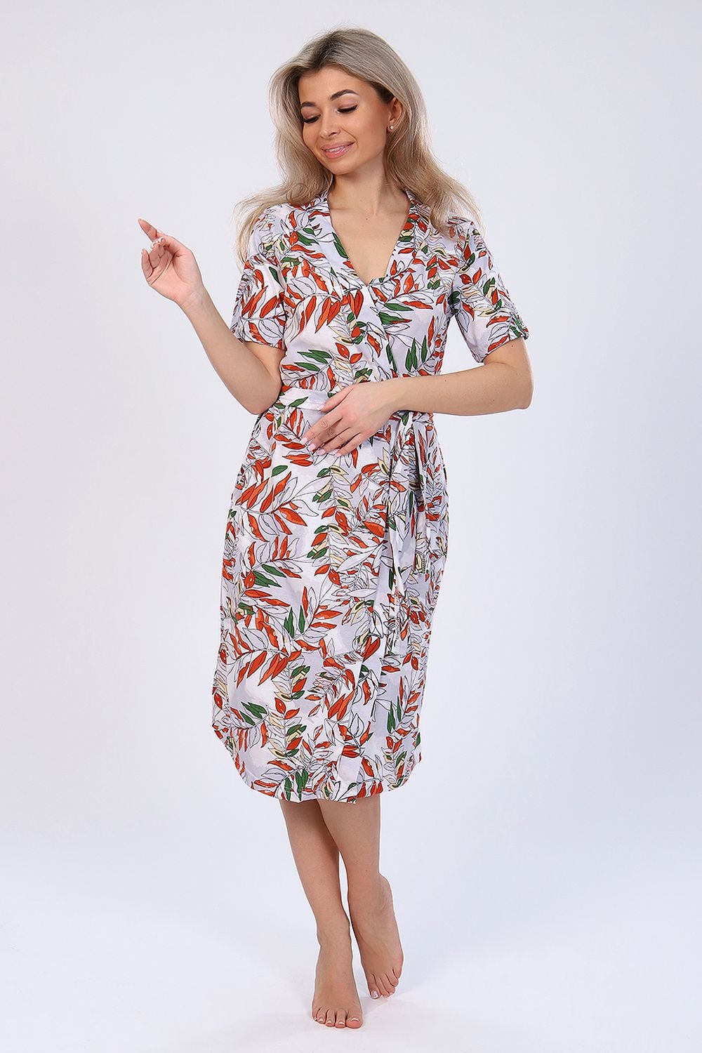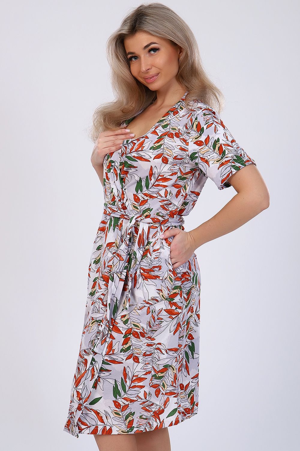 Халат на запах с поясом. Рукава короткие, карманы в боковых швах. Комфортен для повседневной носки.