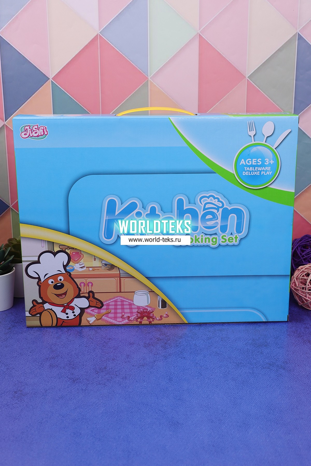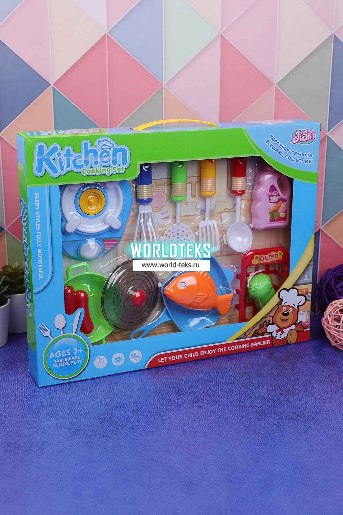 В комплект входит: газовая плита, кастрюля, сковородка с рыбой, венчик, шумовка, лопатка, половник, масло кукурузное, корзина.