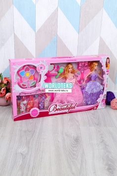 В набор входит: две куклы, палетка теней, шесть платьев, два зеркала, фен, двое духов, расческа.