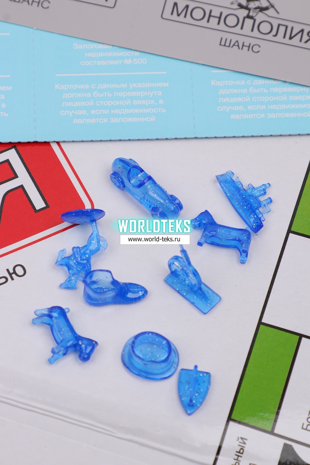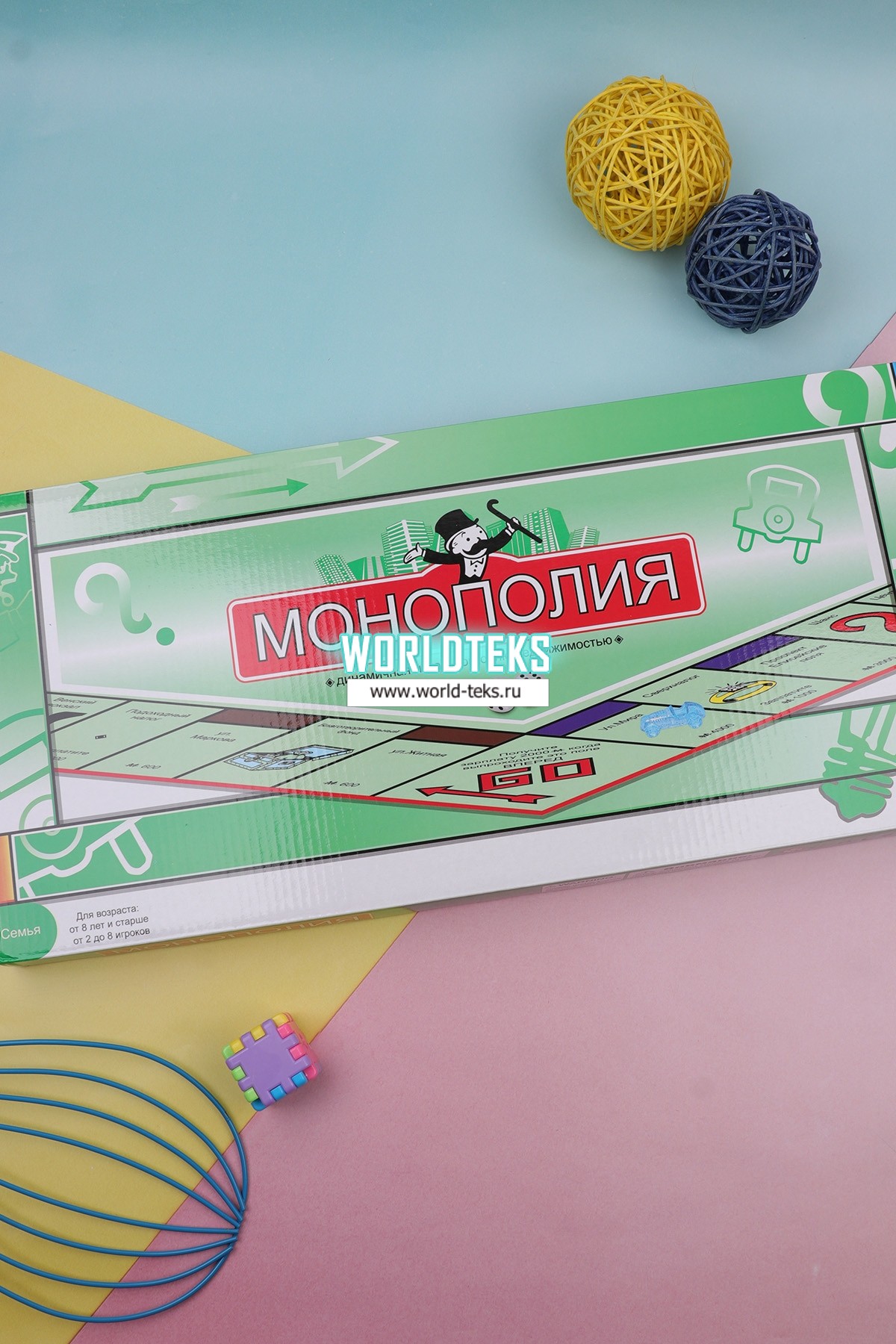 В наборе: игровое поле, 8 жетонов, 28 карточек на право собственности, 15 карточек "шанс", 15 карточек "благотворительный фонд", 32 дома, 12 отелей, 2 кубика, игровые деньги, правила игры.