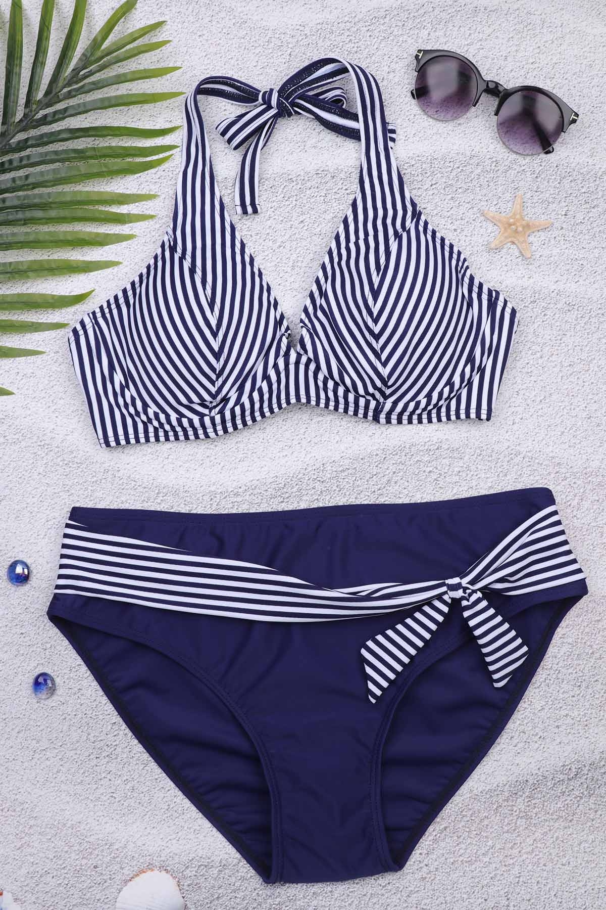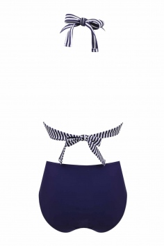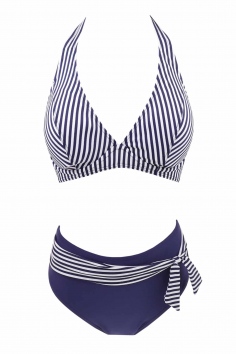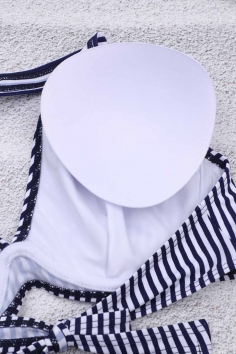 Купальник женский раздельный, состоит из лифа и плавок. Лиф с тонкими съёмными поролоновыми вставками и косточками, с завязками на шее и спине. Плавки средней посадки.