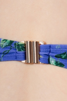 Купальник из полиамида, сине-фиолетового цвета, с цветочным принтом, с подкладками, на регулируемых завязках, с косточками по бокам, с вырезом посередине на косточке.