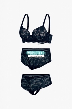 В комплекте бюстгальтер и трусики. Бюстгальтер синего цвета, из кружевной ткани, на косточках, с небольшим Пуш-ап, с обрамлением по чашечкам и низу, лямки регулируются. Трусики, стринги и слипы, синего цвета, из кружевной ткани с принтом, на мягкой резинке.