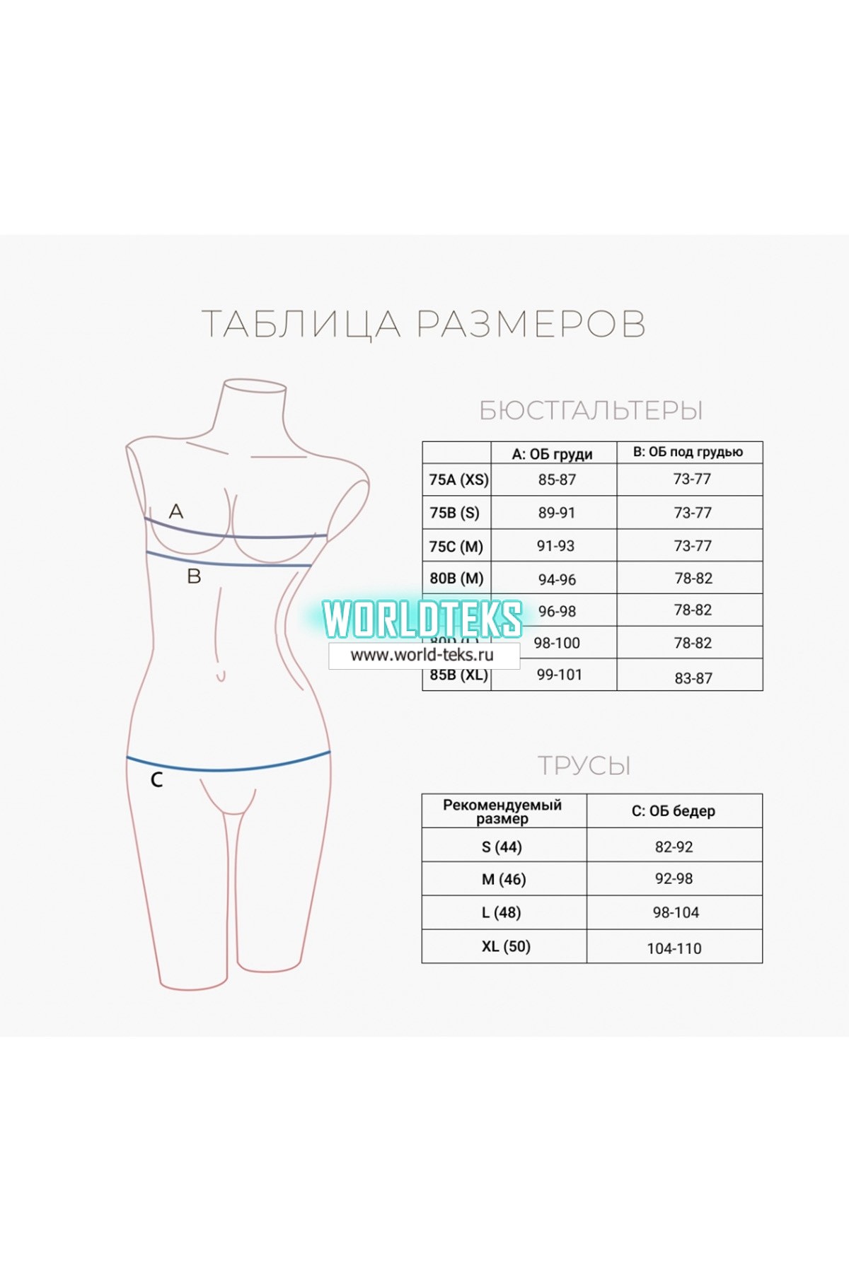 Размеры: бюст - 75А (XS), 75В (S), 75С (М), 80В (М), 80С (L), 80D (L), 85В (XL).