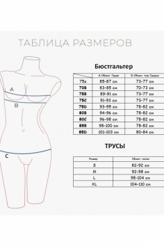 к бюстгальтеру идут трусики, размерами - 75B-S, 75C-M, 80B-M, 80C-L.
