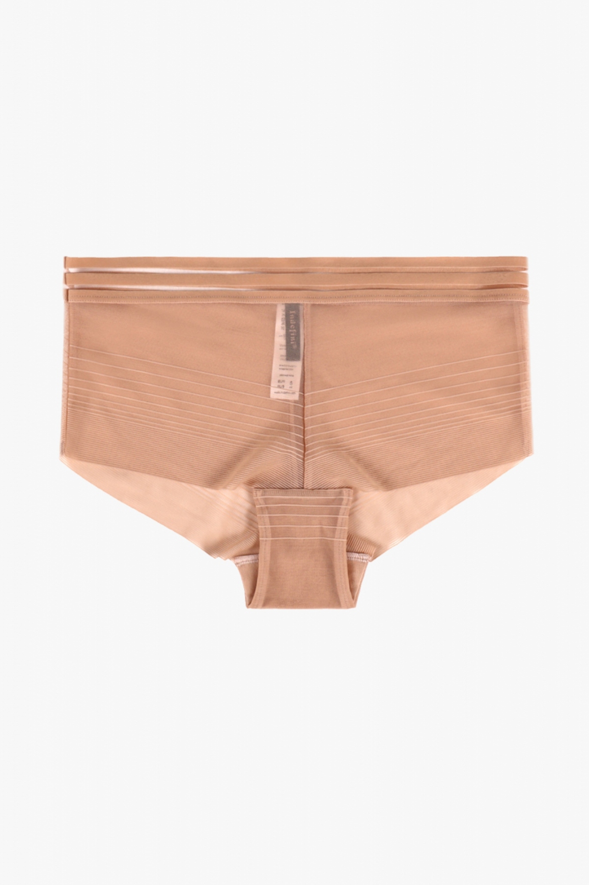 Трусы-слипы из полиамида, бежевого цвета, с кружевными вставками, высокой посадки.