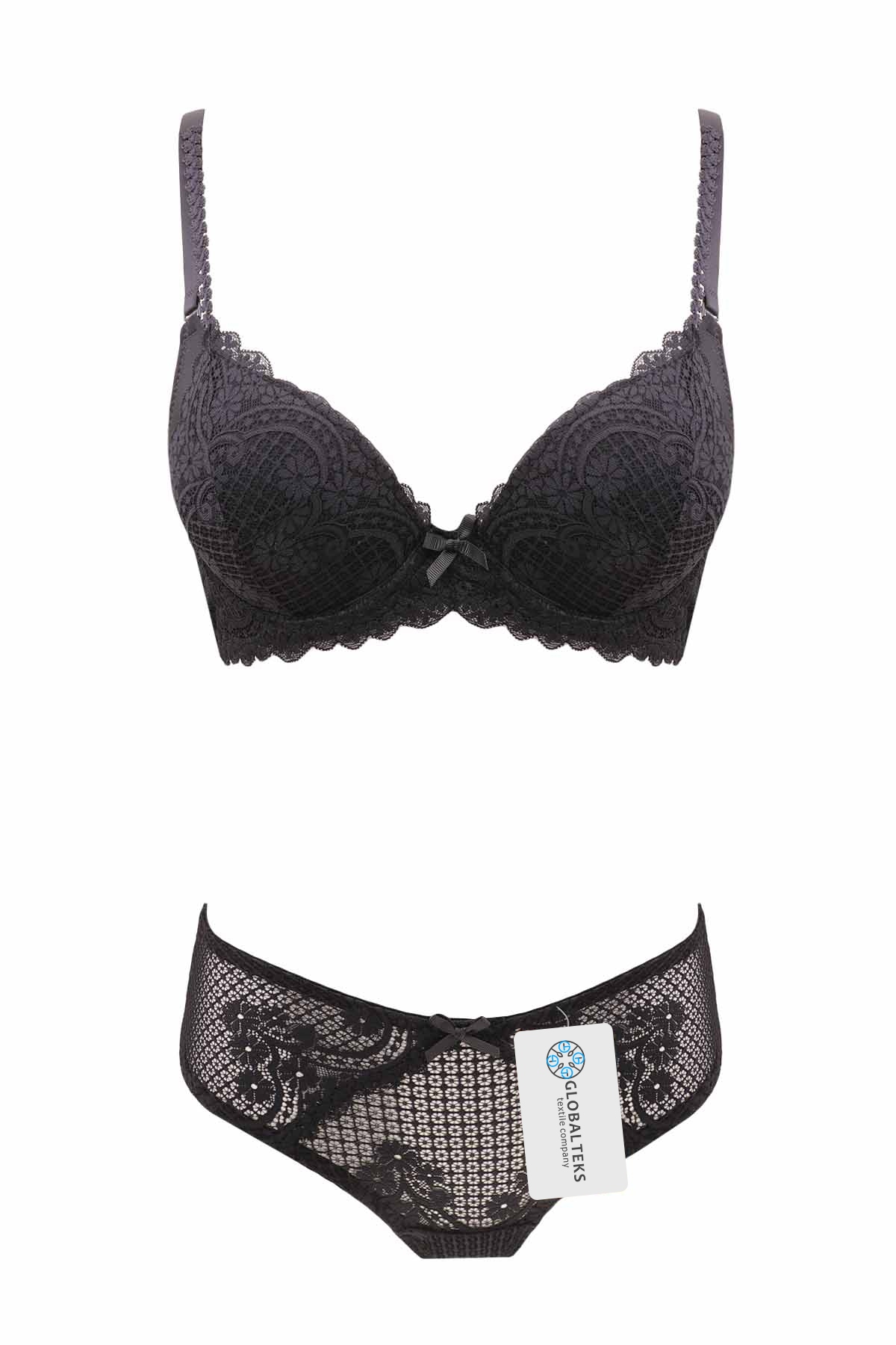 Бельевой комплект женский: бюстгальтер, трусы. Бюстгальтер с формованными чашечками и с косточками. Застёжка на крючок и петли сзади. Съёмные бретели регулируются по длине. Бюстгальтер украшен тонким кружевом и бантиком посередине. Кружевные трусы средней посадки с эластичными мягкими резинками украшены бантиком посередине.
